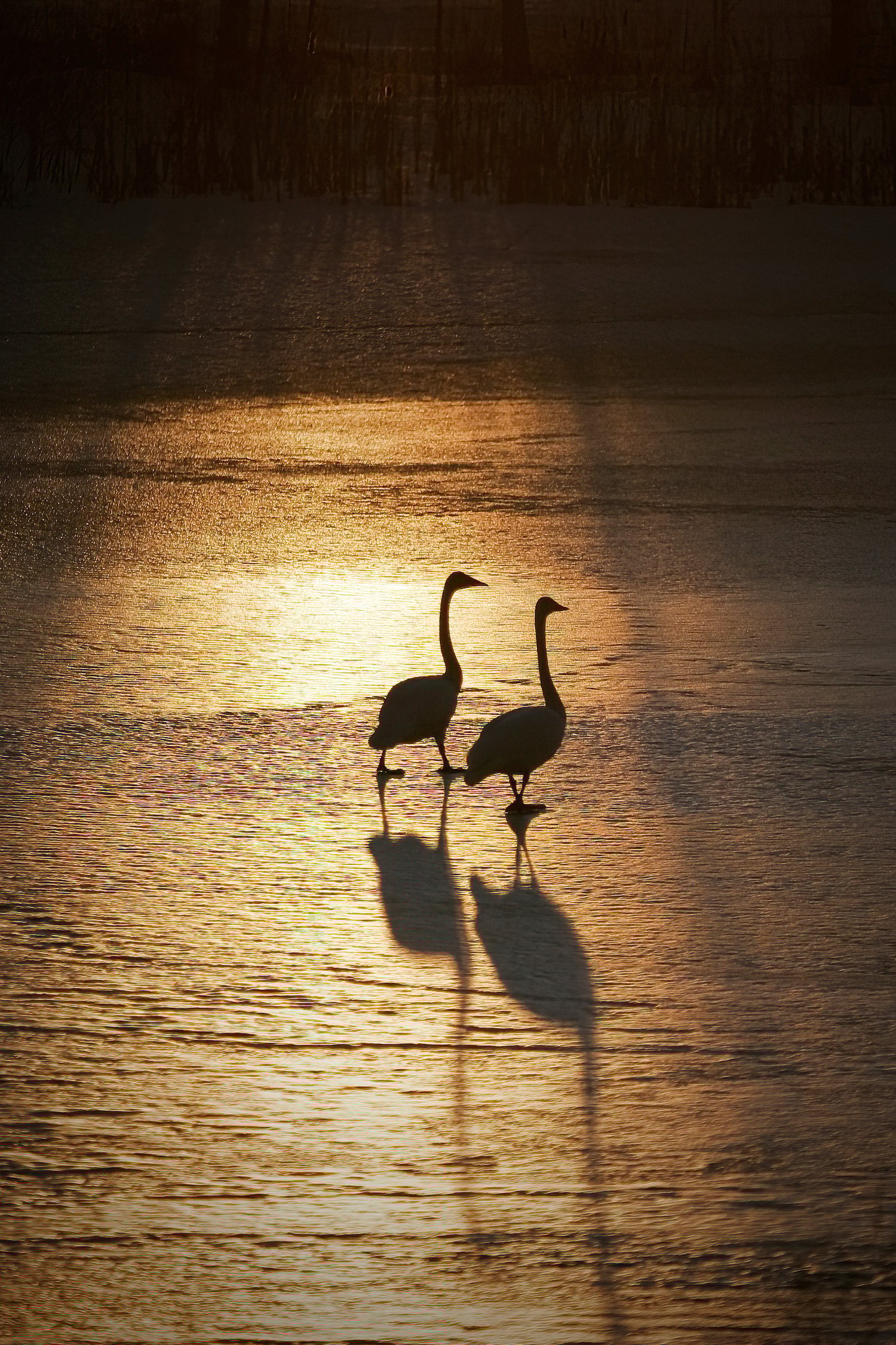 Whooper swans (Cygnus cygnus) on the ice at sunset.