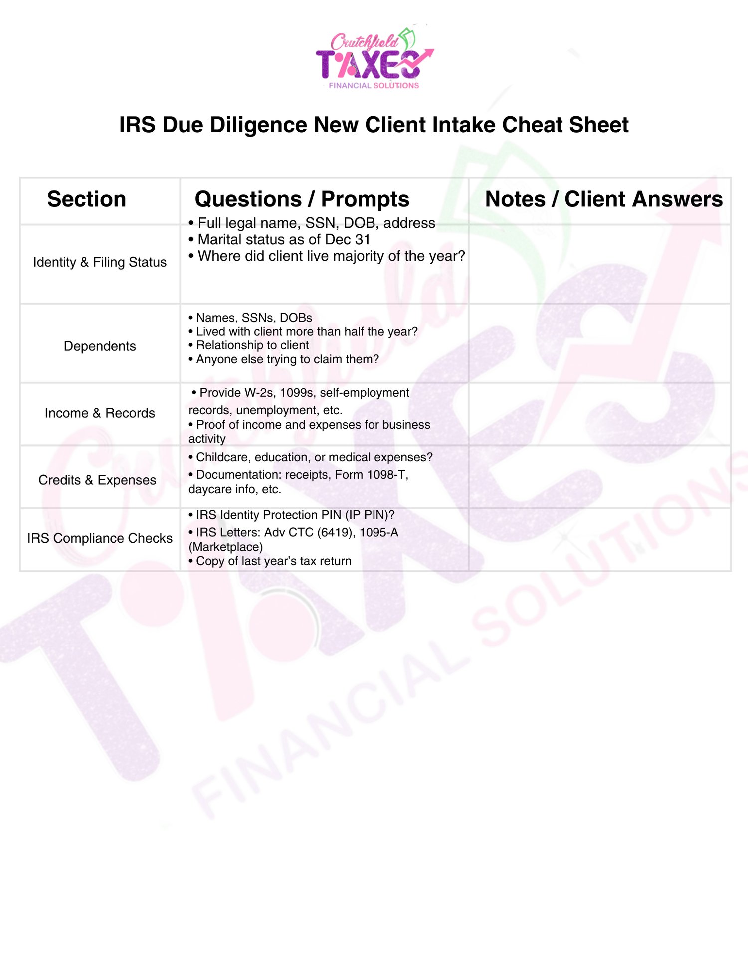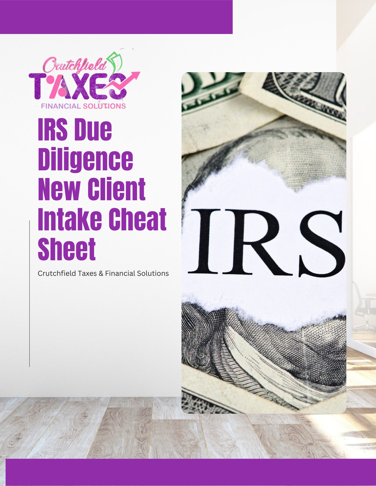 Streamline your client intake process with this easy-to-use cheat sheet designed specifically for IRS due diligence. Ensure compliance, gather essential information quickly, and reduce errors during new client onboarding. Perfect for tax professionals looking to save time and stay organized.