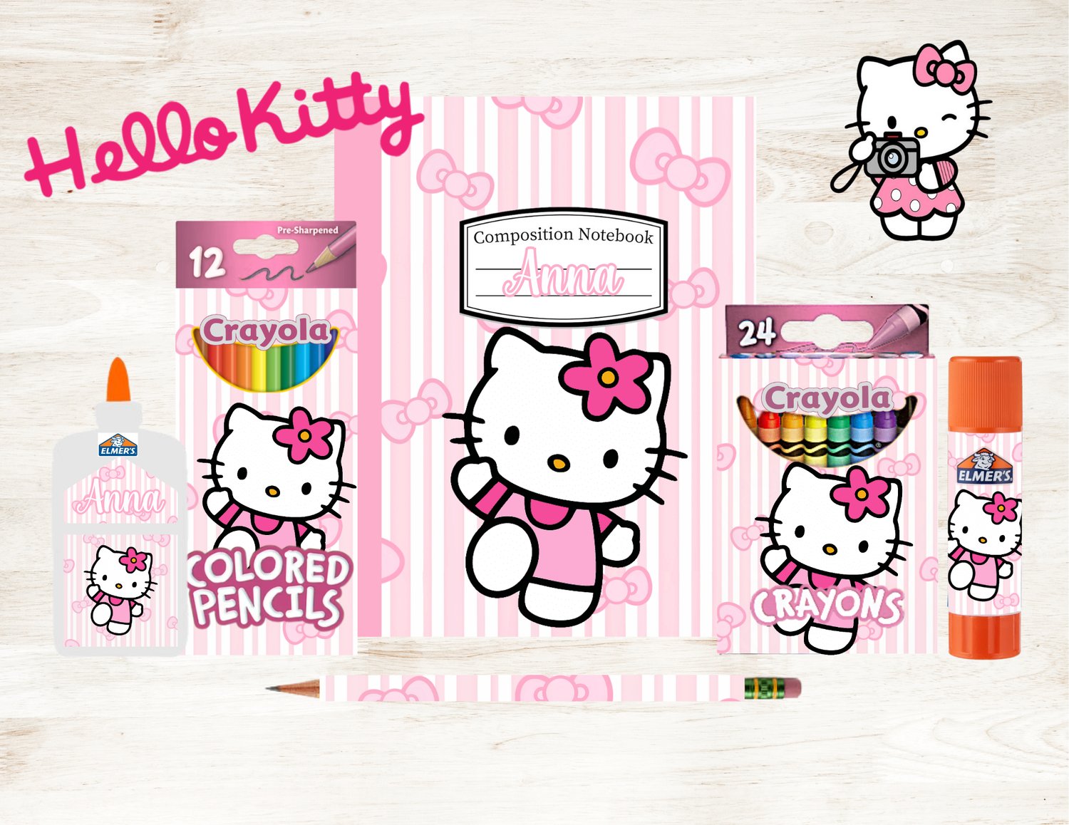 Personalized Hello Kitty School Supplies Set | Custom Name Notebook + Crayons, Pencils & Glue | Hello Kitty Themed Back-to-School Kit