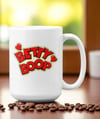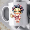 Rise, shine, and sass your way through the morning with this oversized ceramic mug featuring the iconic inspired Betty Boop in her curlers, robe, and slippers—coffee in hand and attitude intact. Logo in red on back. Whether personalized with your name or gifted to a fellow caffeine queen, this mug brings retro charm and a whole lot of personality to your daily brew.