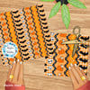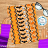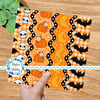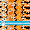 Spooky halloween stripes with skulls, bats, pumpkins and flowers in orange and black.