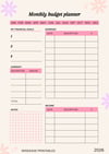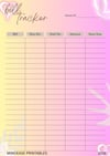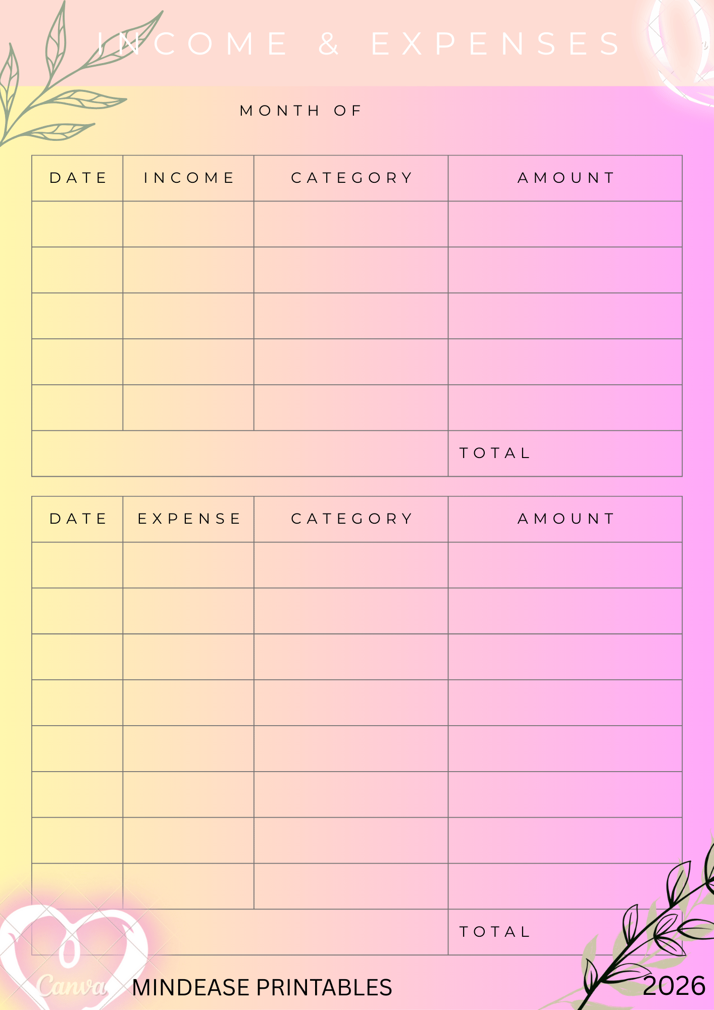• File Format: PDF (high-resolution, print-ready) • Page Size: 8.5" x 11" (US Letter) / A4 compatible • Number of Pages: 5 printable finance planner pages • Color: Full color (pink, purple, yellow gradient design with floral elements) • Print Settings: Best results with color printer on quality paper or cardstock • Currency: Adaptable - use € (Euro), $ (Dollar), or any currency