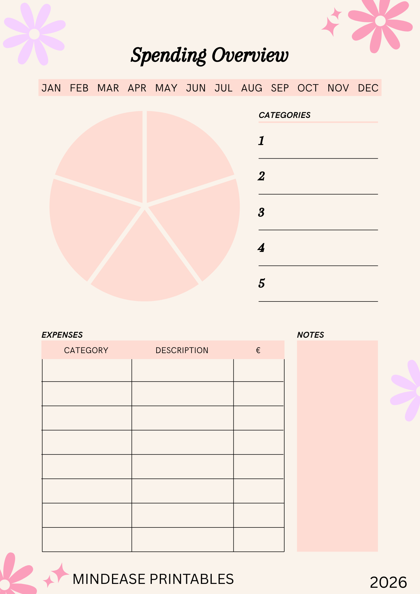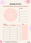 📊 Spending Overview Visualize your spending patterns with a clean pie chart and category breakdown. Track up to 5 spending categories with detailed expense logging (date, description, amount). Compare budget vs. actual spending to identify where your money really goes. Includes notes section for insights and adjustments.