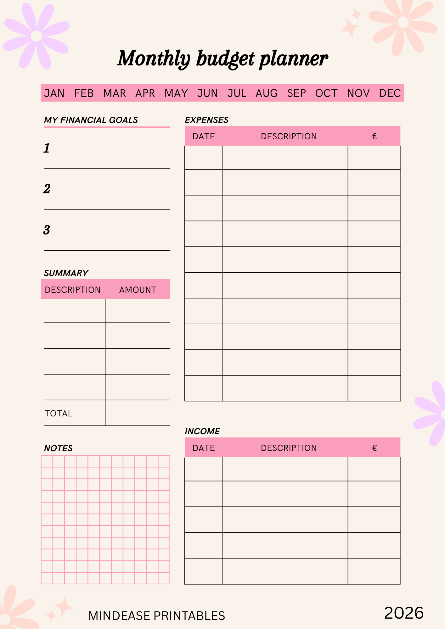 💰 Monthly Budget Planner Set and track your financial goals with dedicated sections for income tracking (multiple sources, gross amount, after tax), expense monitoring, and budget summary. Includes space for 3 financial goals, total calculations, and notes section for monthly reflections.