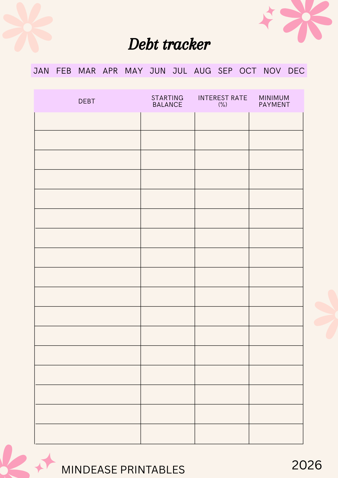💳 Debt Tracker Take control of your debt with a comprehensive tracking system. Monitor multiple debts with columns for debt name, starting balance, interest rate (%), and minimum payment. Track your progress month-by-month across the entire year (JAN-DEC) and watch your balances decrease.