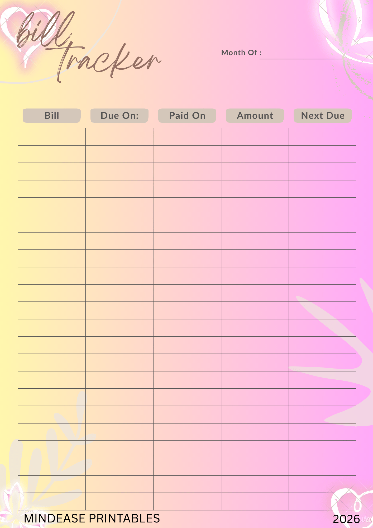 📅 Bill Tracker Never miss a payment again! Organize all your monthly bills with columns for bill name, due date, paid date, amount, and next due date. Space for 20+ bills with room to track recurring payments and stay on top of your financial obligations.