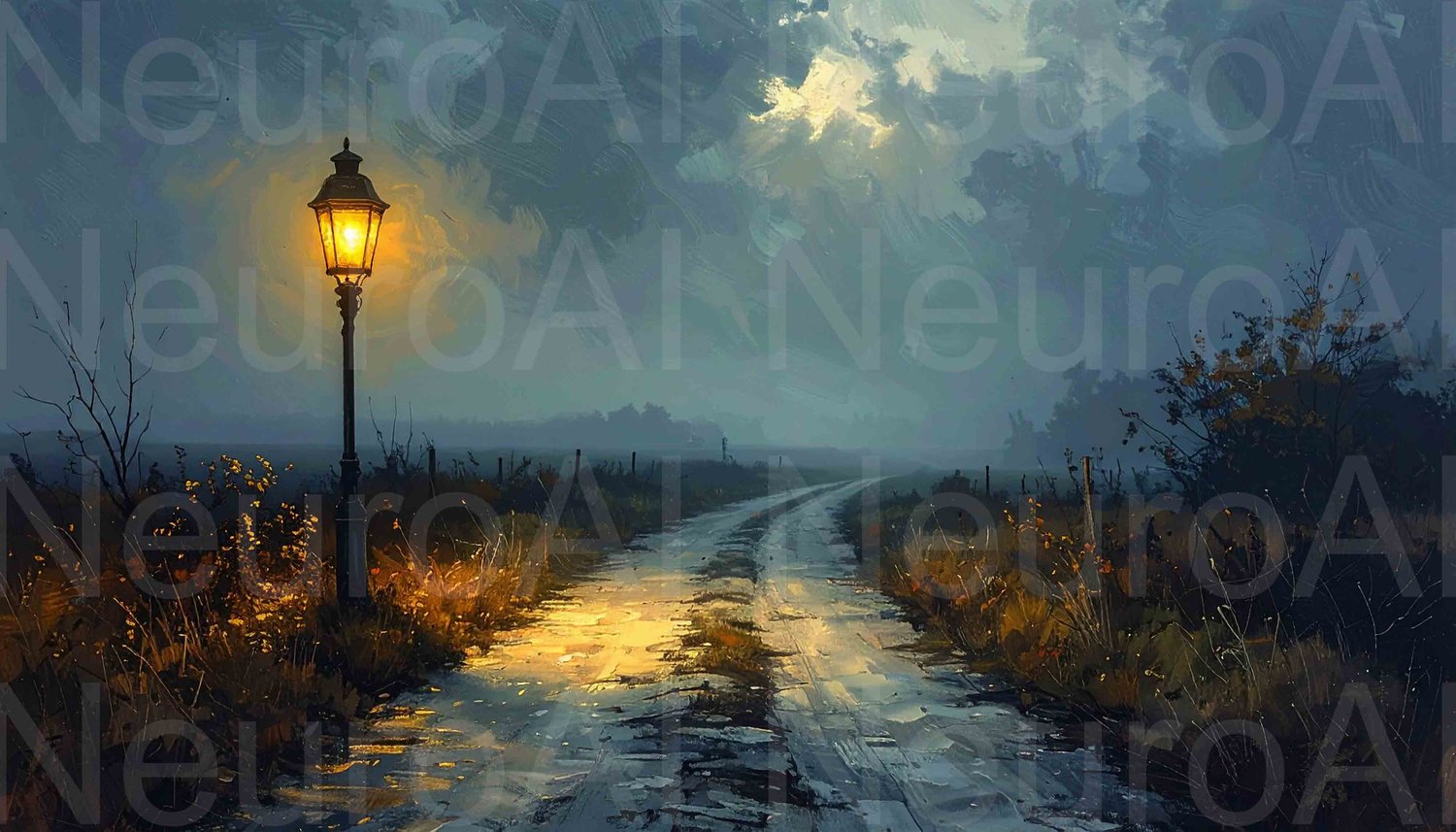Gloomy path lit by vintage lamp, moody atmosphere