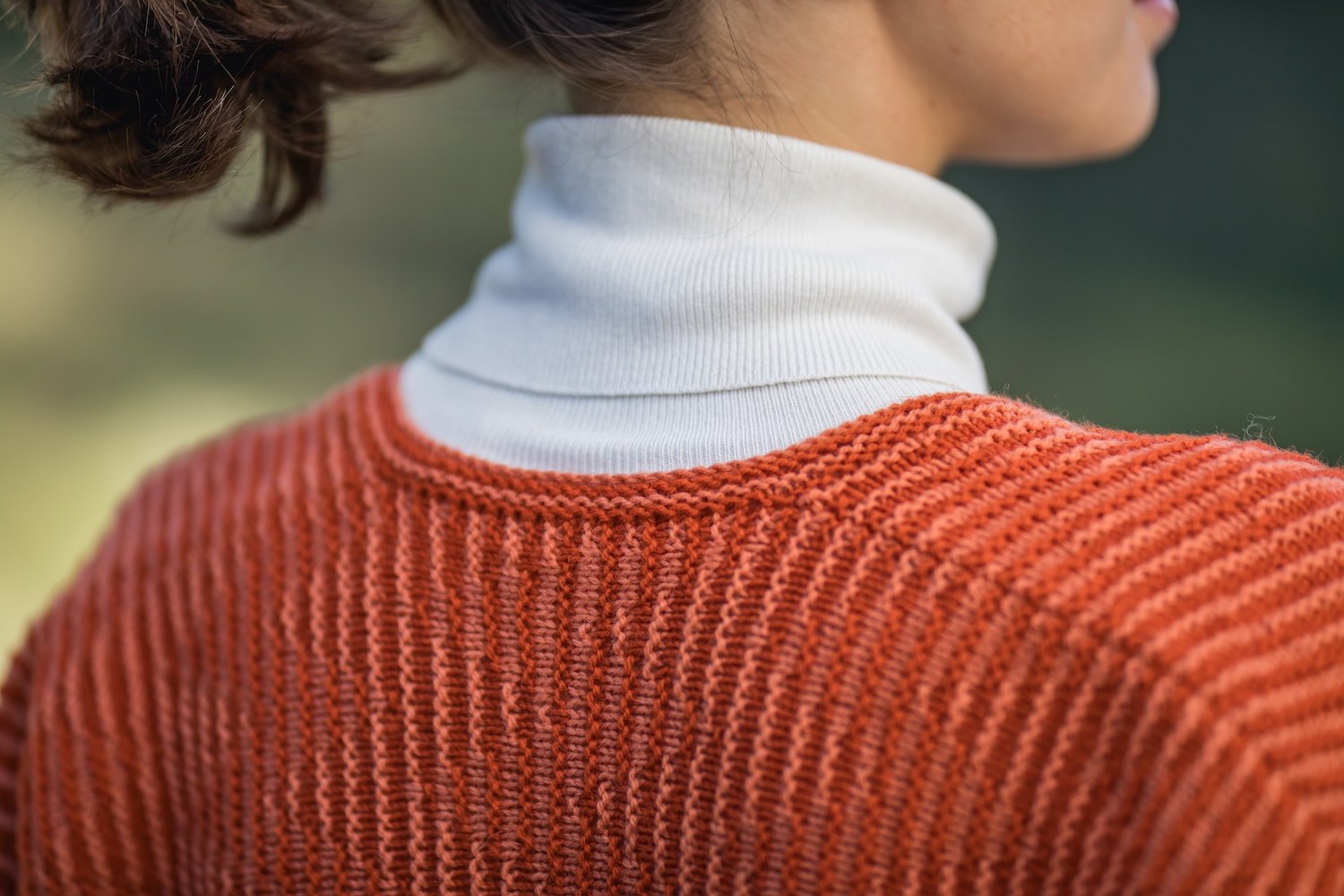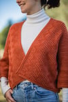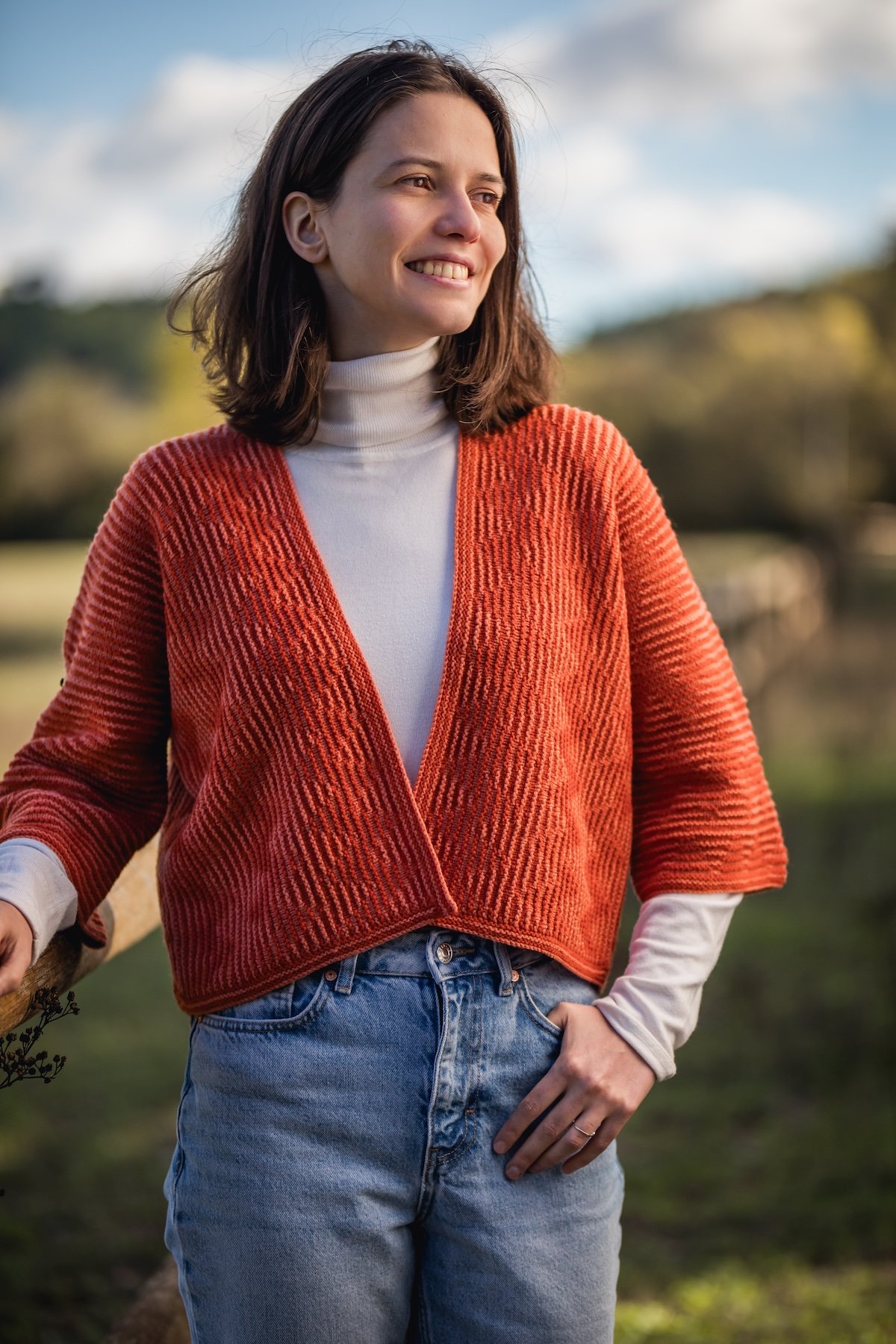 The highlight of this jacket is undoubtedly the shadow (or illusion) knitting technique, hence its name, “Sombra” (meaning “shadow” in Portuguese). The chevron motif appears and disappears with just a slight move. This jacket is sure to raise the curiosity of anyone you meet. The garment changes every time you move!