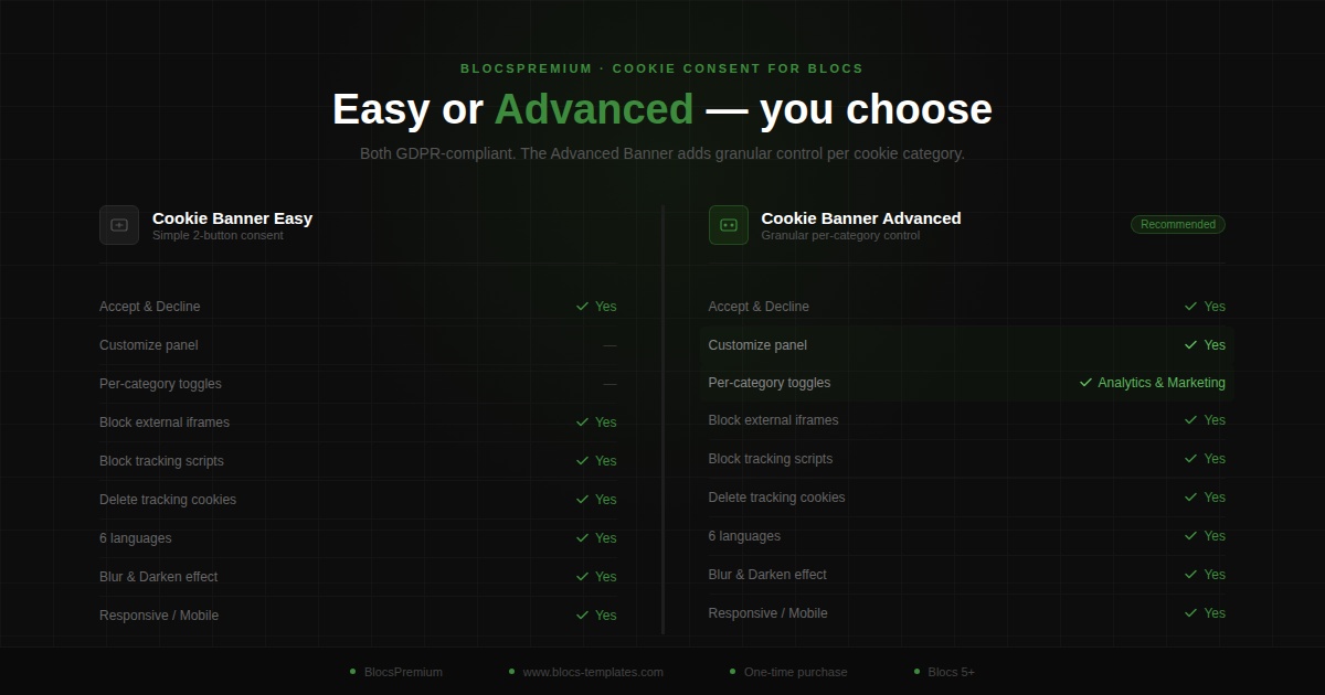 Premium Cookie Banner Easy — GDPR Compliant for Blocs