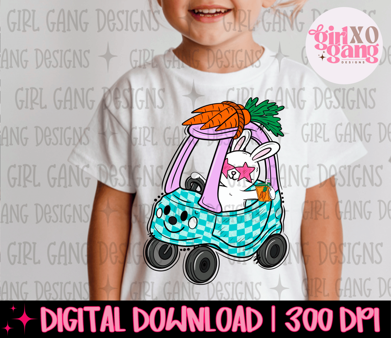 Cute kids Easter cozy car png , Easter bunny driving kids car, checkered cozy car png