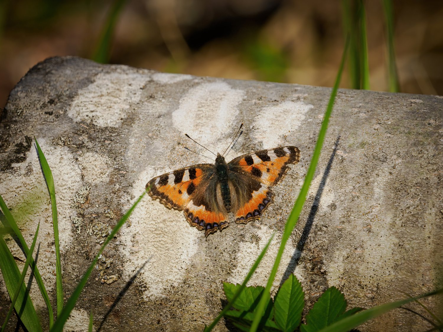 A butterfly rests on a felled tree