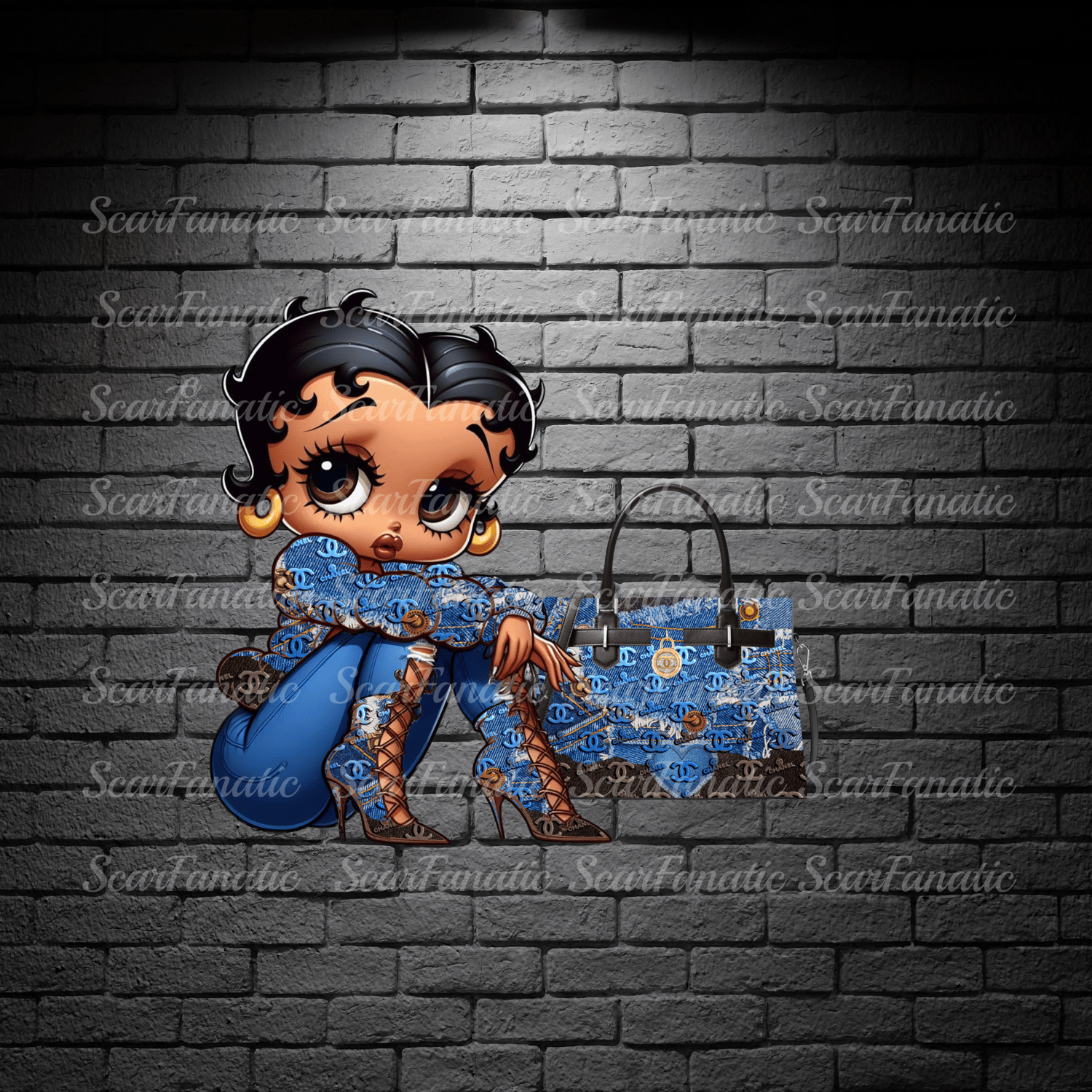 Betty Boop in Denim Chnl Jacket with Matching High Heels and Gold Earrings, Denim Chnl Purse, Sublimation, PNG, DTF, 300DPI, high resolution