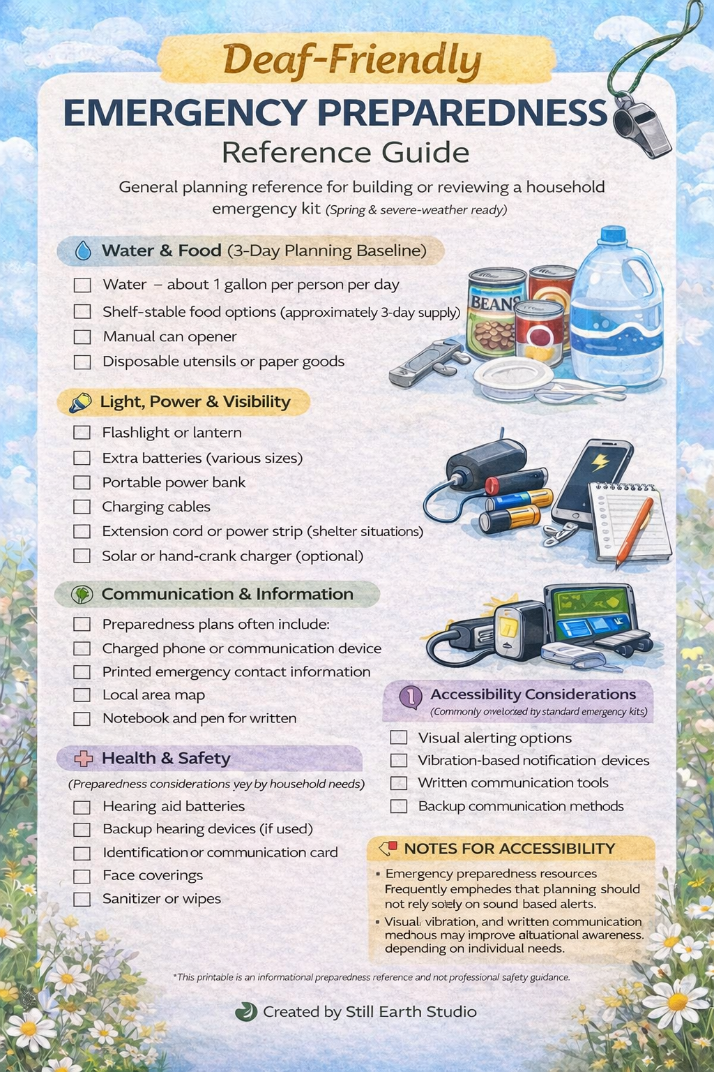Instead of a directive checklist, this guide presents commonly recommended emergency items alongside accessibility considerations frequently overlooked in standard kits.