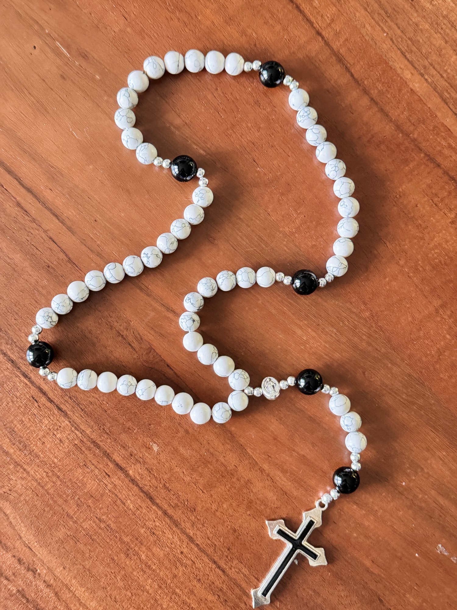 Each Catholic rosary is assembled bead by bead with intention and prayer. This men's prayer rosary combines 8mm natural white-grey marble Hail Mary beads with substantial black onyx Our Father stones, silver-tone separators, a Miraculous Medal centerpiece, and a premium silver-burned cross—creating a devotional companion built to last generations.