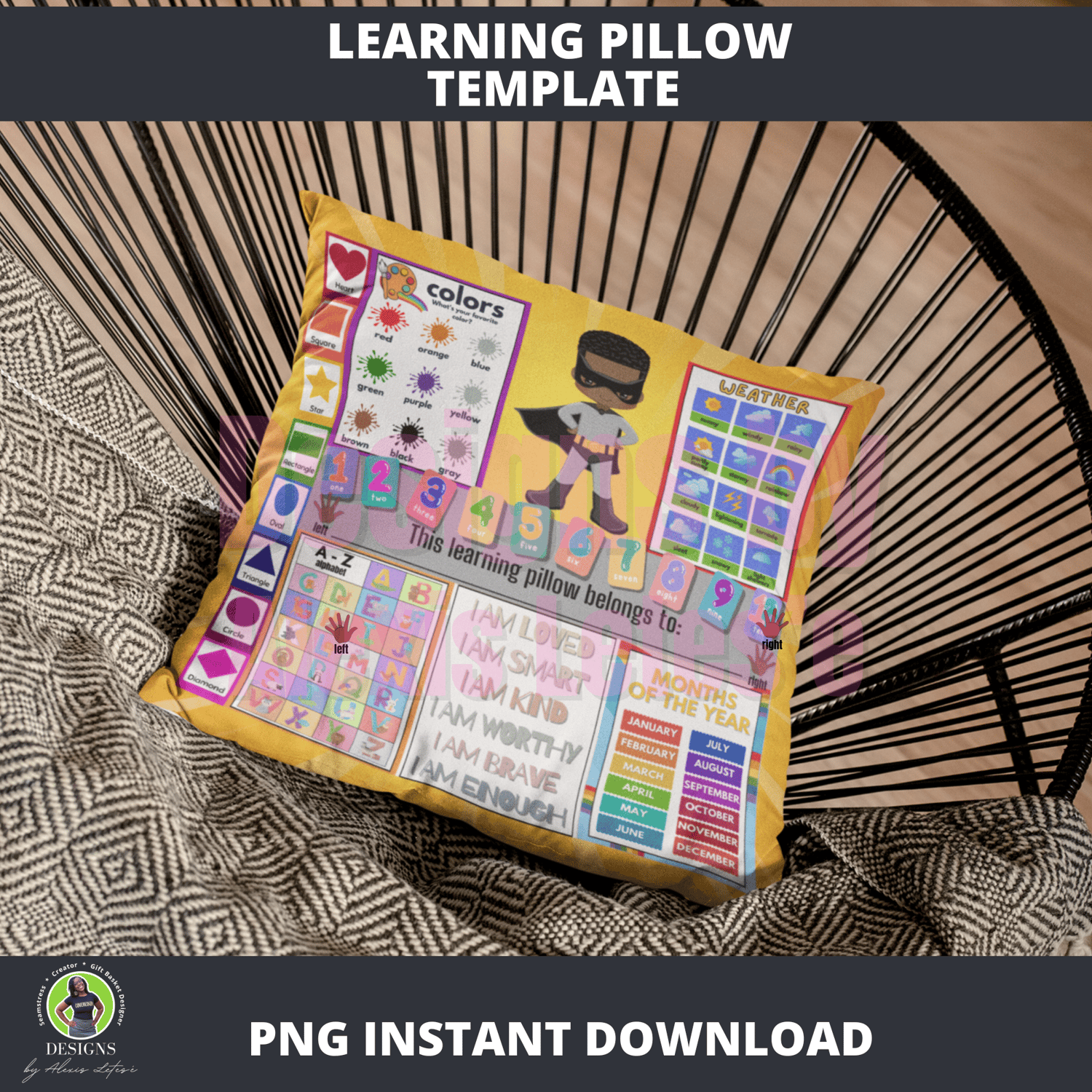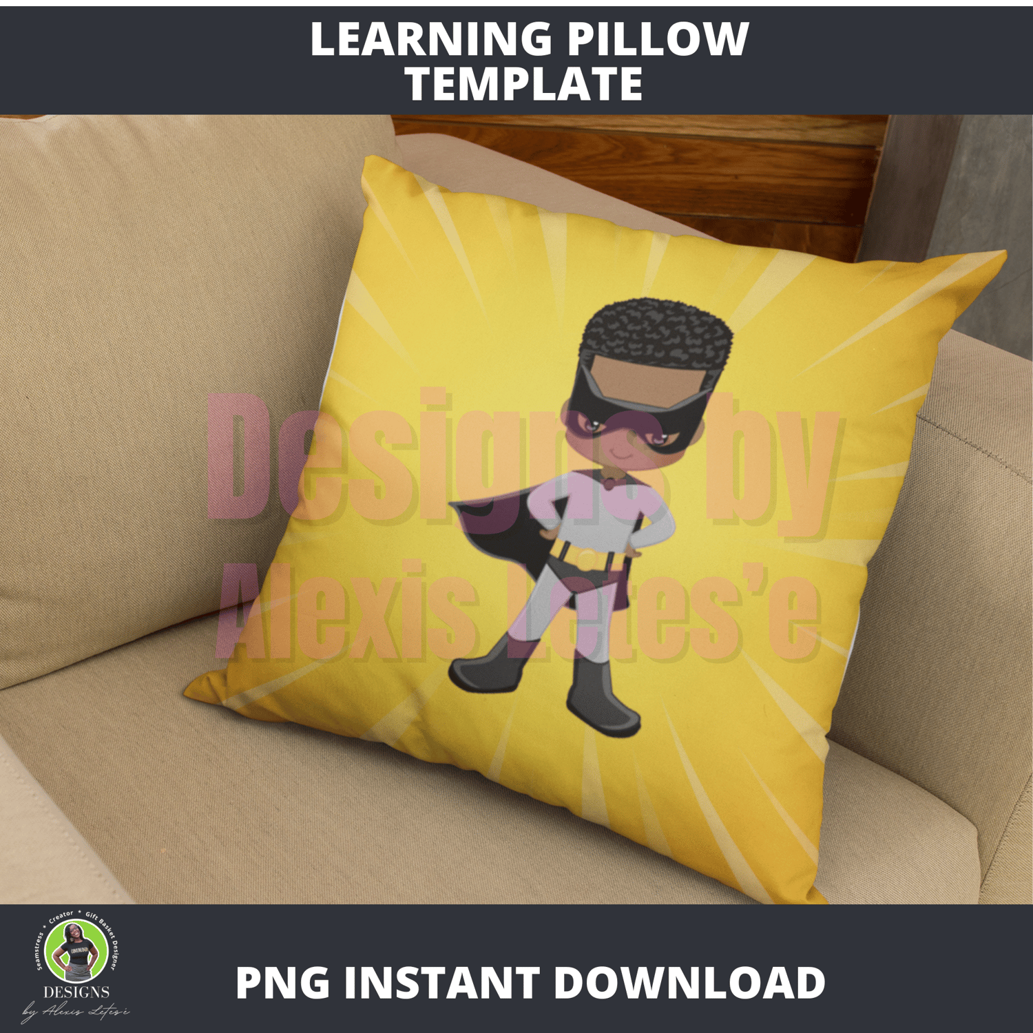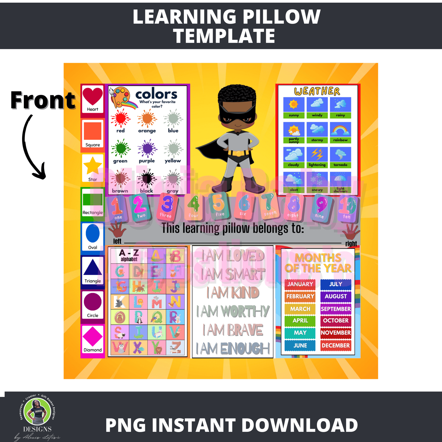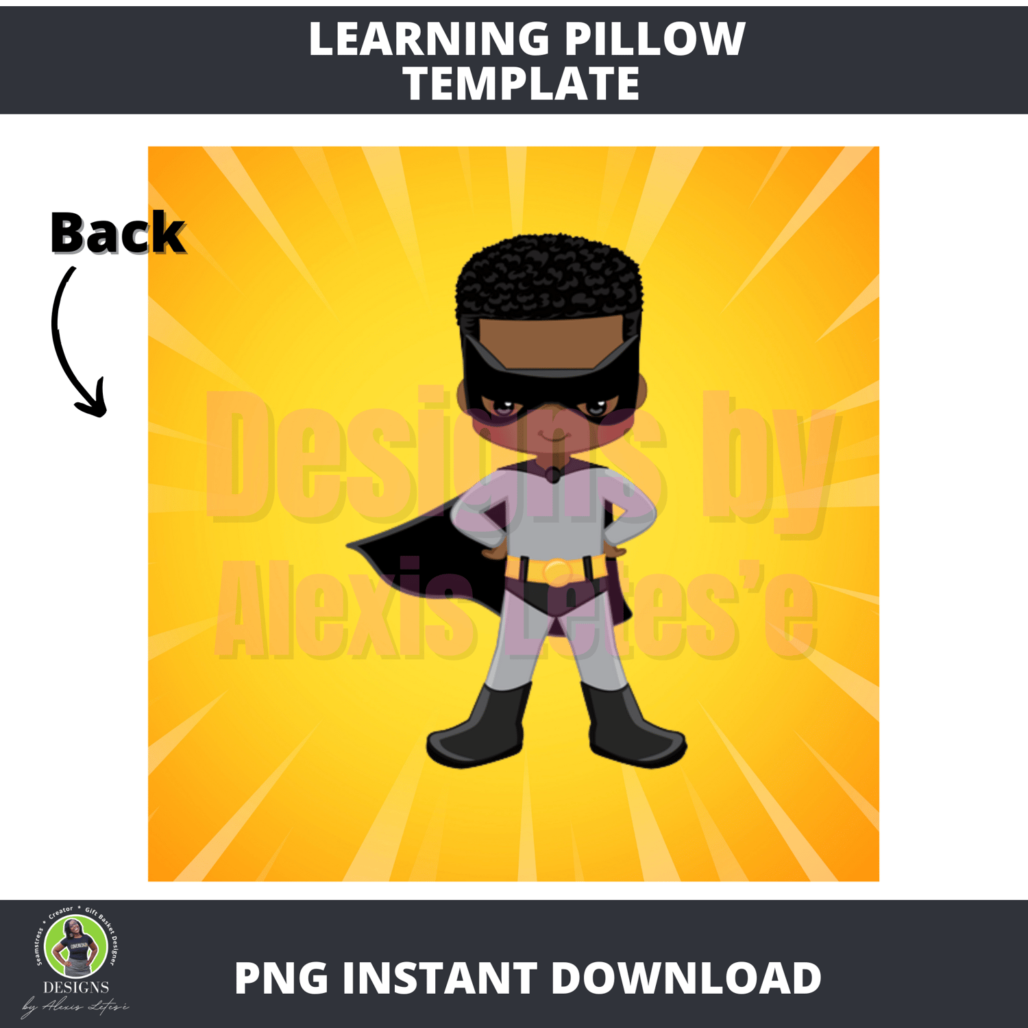 Batman Inspired Learning Pillow Template | Black Boy Superhero | Two-Sided Educational Design | Commercial License for POD Creators