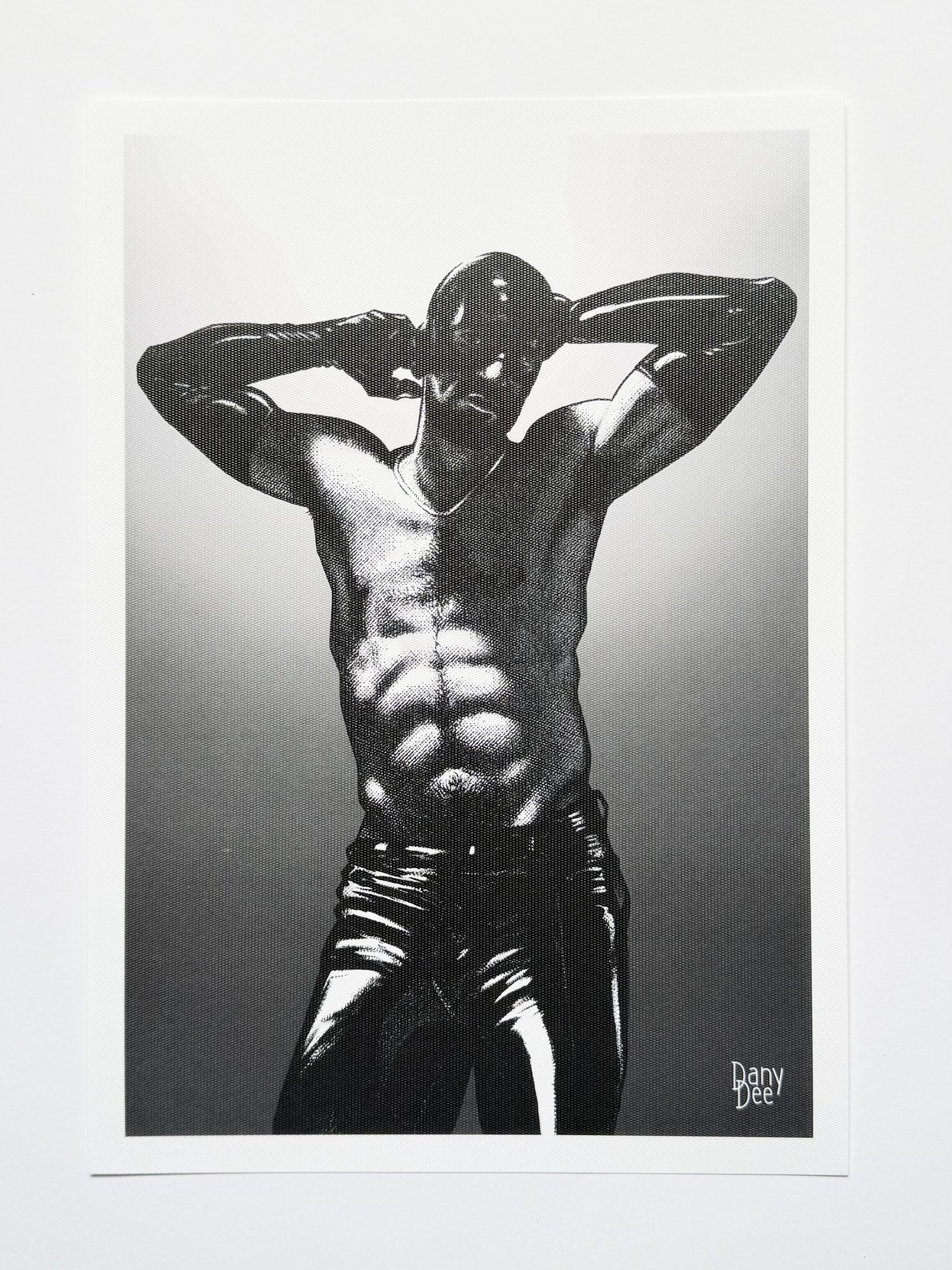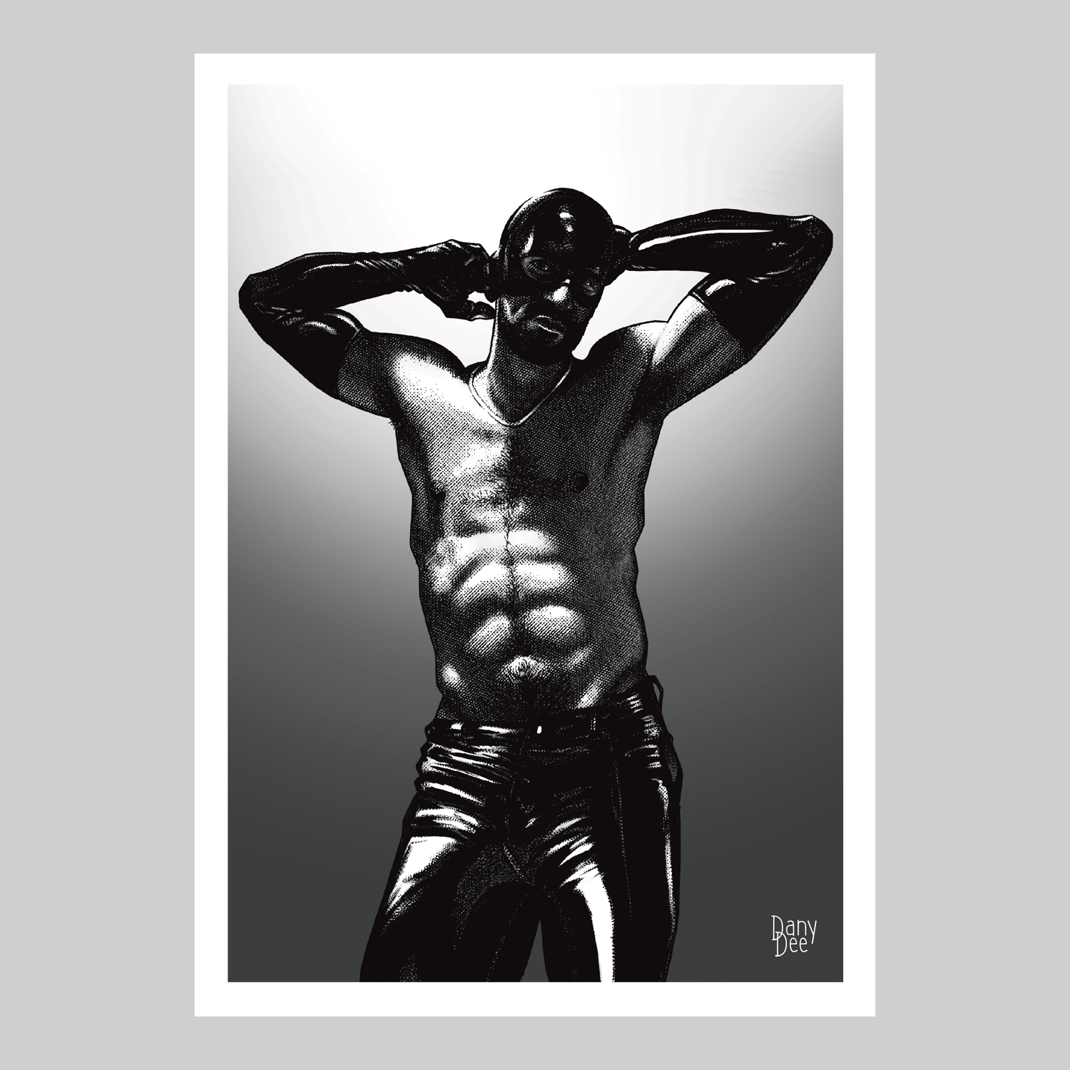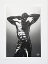 "The Latex No. 3" is a hand-drawn, monochromatic A4 art print celebrating latex fetish culture — a bold homoerotic illustration of a powerfully built man in a latex mask and gloves, arms raised, chest bare, perfect for gay rubber fetish collectors or queer home decor.
