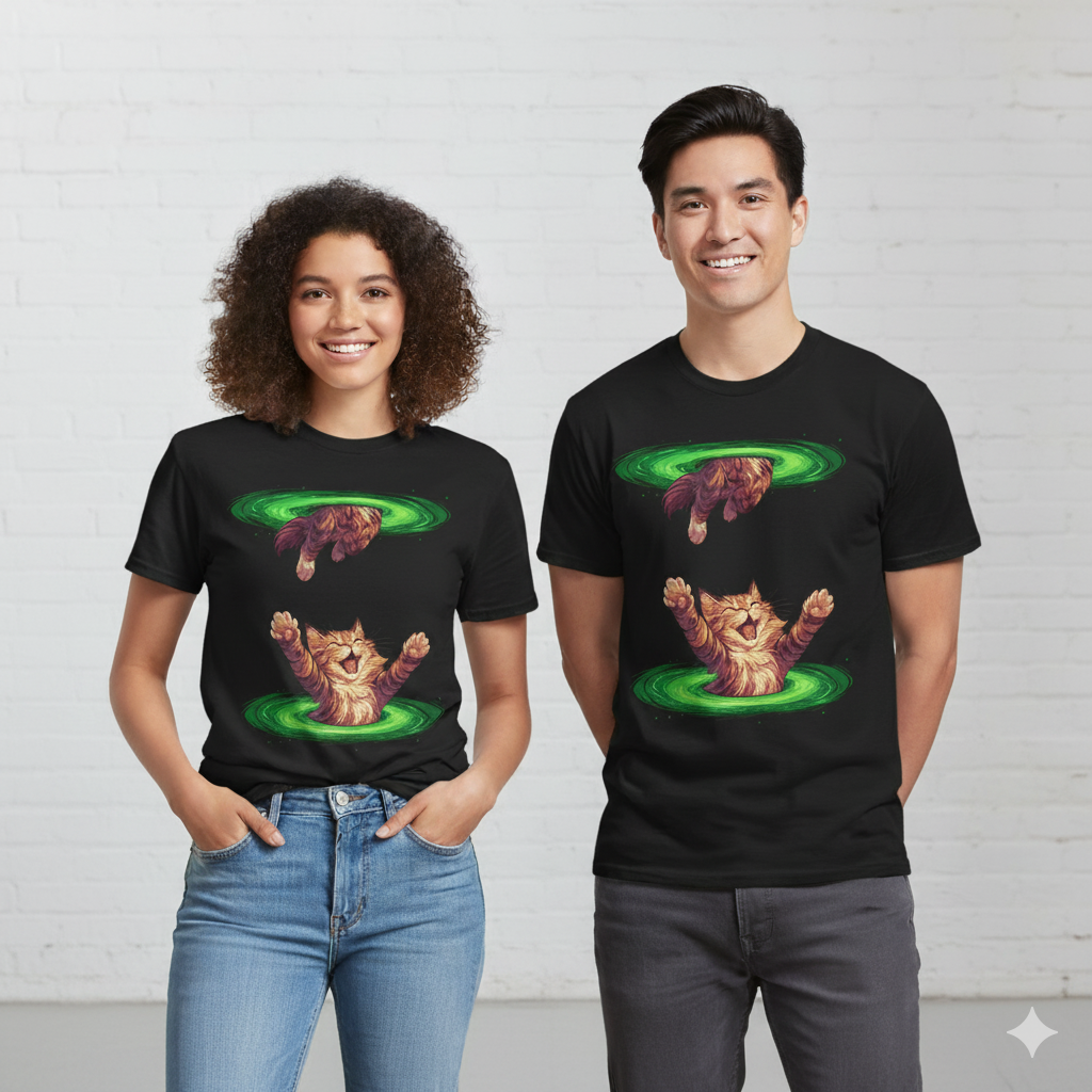 Teleport your style to another dimension with this hilarious shirt for cat lover featuring a curious kitty caught mid-portal jump. With vibrant green vortexes and dynamic feline poses, this tee is a standout t shirt design cat lover that blends humor, imagination, and pure cat chaos.