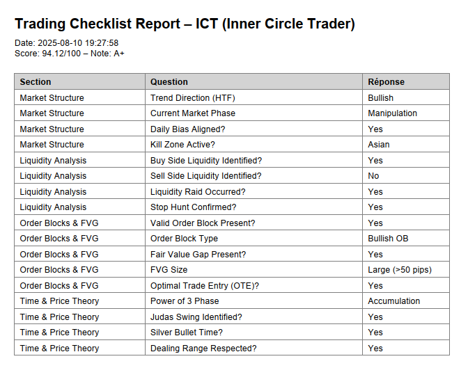 Grùce à ses checklists structurées, ses validations automatiques et son export en PDF, tu élimines les erreurs émotionnelles et standardises ton approche comme un vrai trader pro.