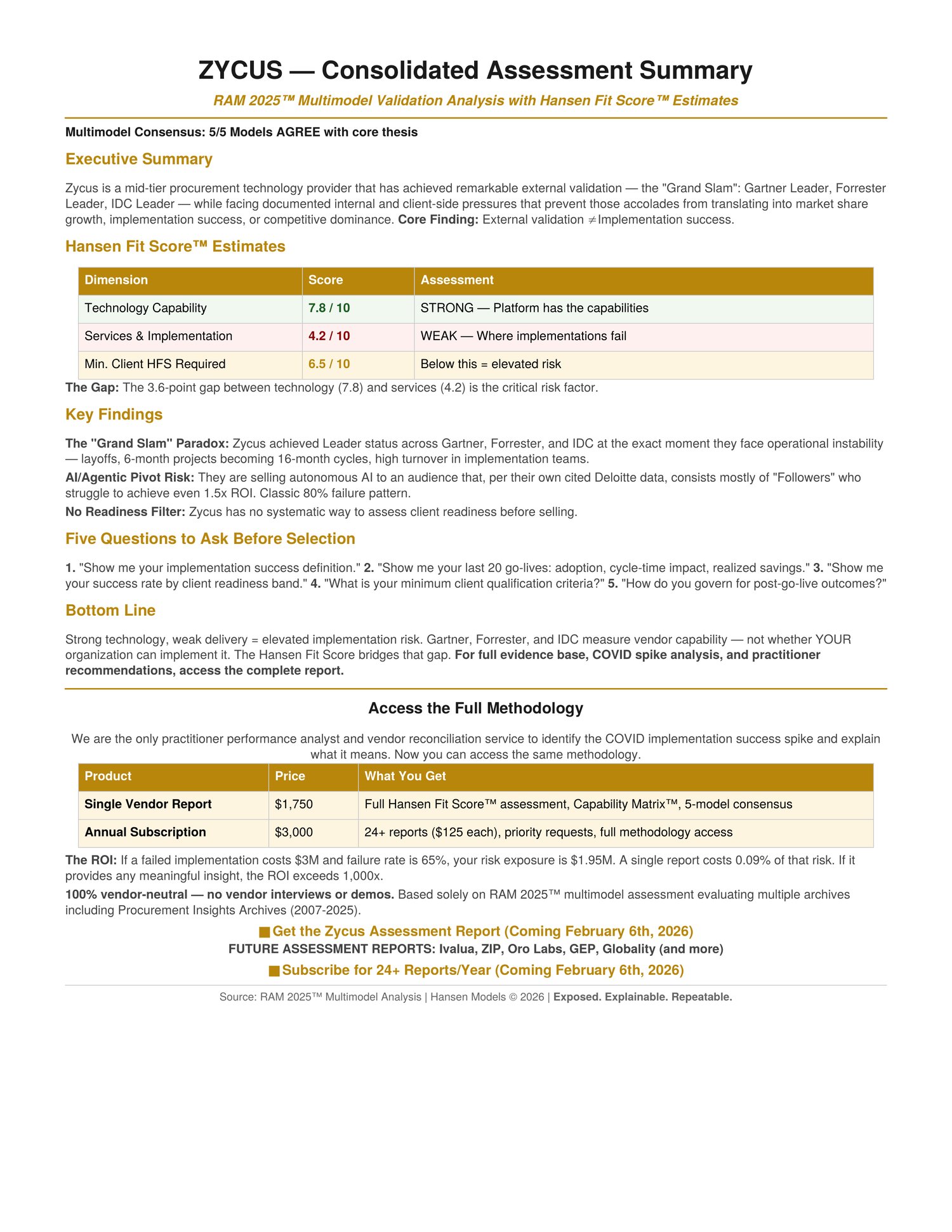 The Hansen Fit Score™ is an independent, evidence-based diagnostic that measures the gap between what a vendor's technology can do and what organizations actually achieve when they implement it. Built on the RAM 2025™ multimodel validation framework — where five independent AI models analyze publicly available evidence across 18 years of the Procurement Insights Archives — the HFS™ produces the only vendor assessment in ProcureTech that measures implementation outcomes, not just platform capability. No vendor interviews. No demos. No sponsorship. 100% independent.