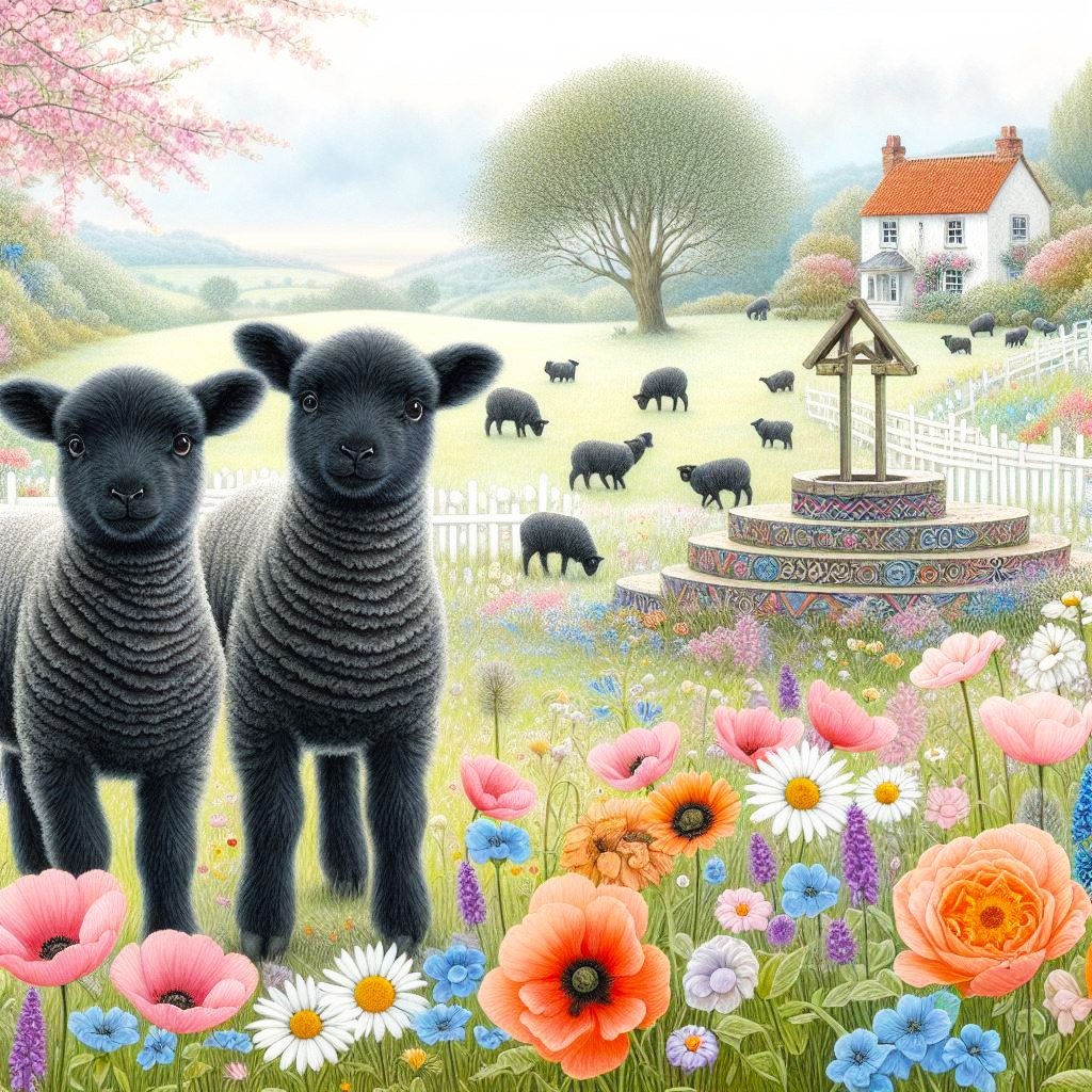 Black lambs in a field with long grass & poppies, bluebells, & big white daisies. There is a patterned wishing well.