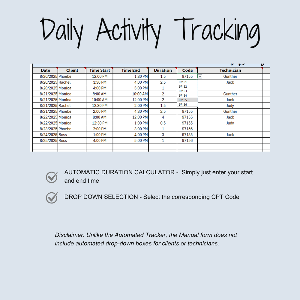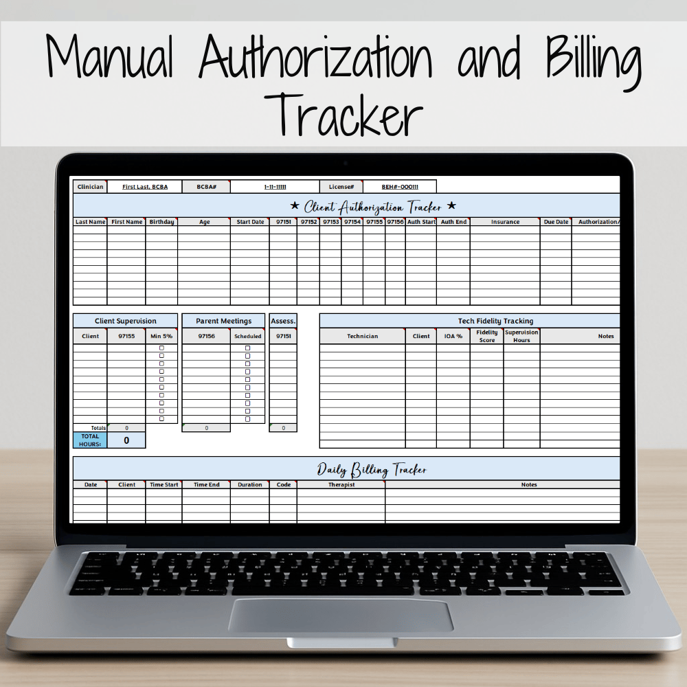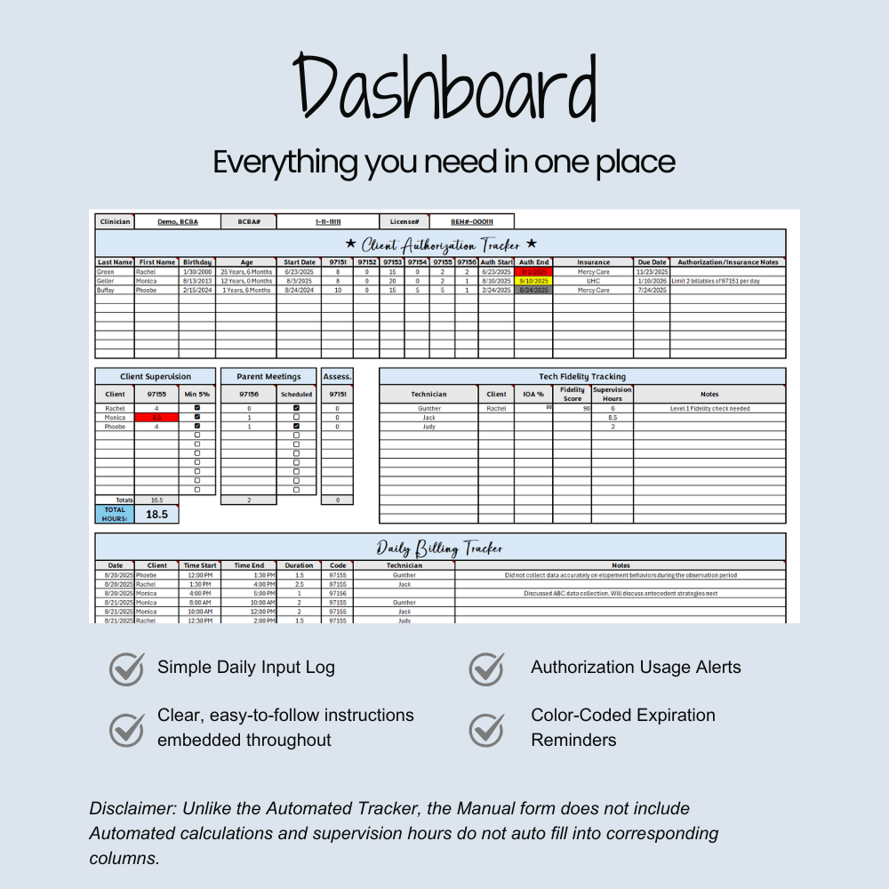 ⚠️ Disclaimer: Unlike the Automated Authorization Tracker, this Manual Tracker does not include automated calculations of supervision hours for technicians or clients. It provides manual entry fields only.