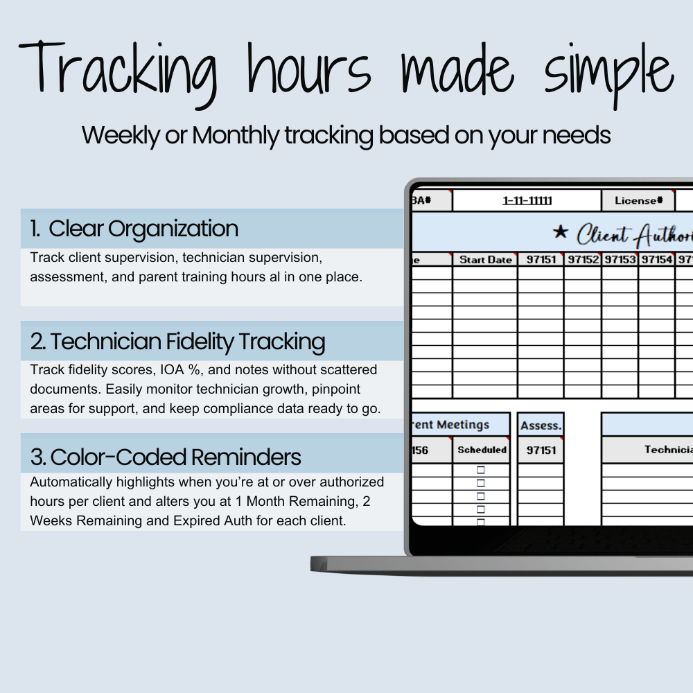 Keep your caseload organized and stress-free with this easy-to-use tracker designed to simplify your daily workflow. Everything you need to track client authorizations and billing in one place.
