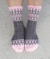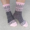- designed for fingering weight (approx. 400-420 m / 100 g) yarns: 25-35 grams of C1 (light pink) and 40-55 grams of C2 (grey)