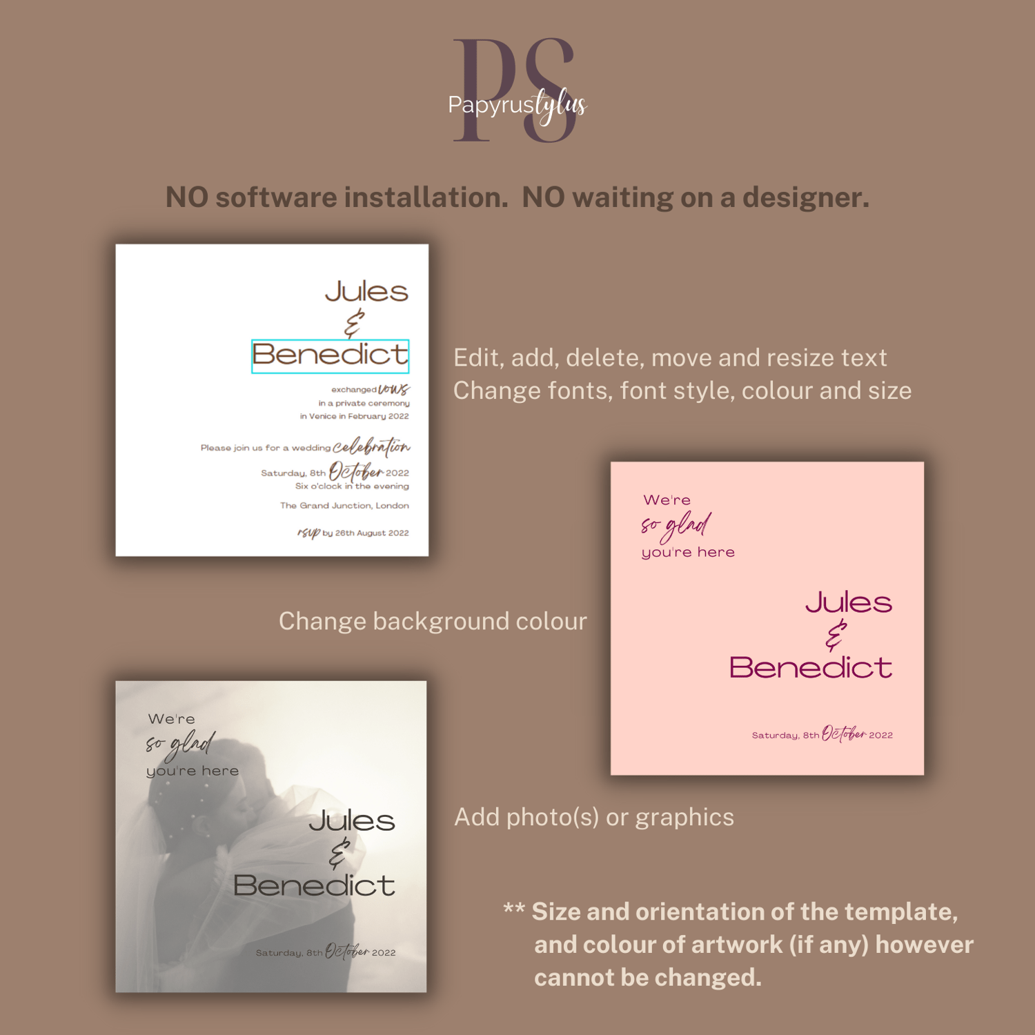 - Size and orientation of the ready-made template(s) and colour of artwork (if any) cannot be modified.