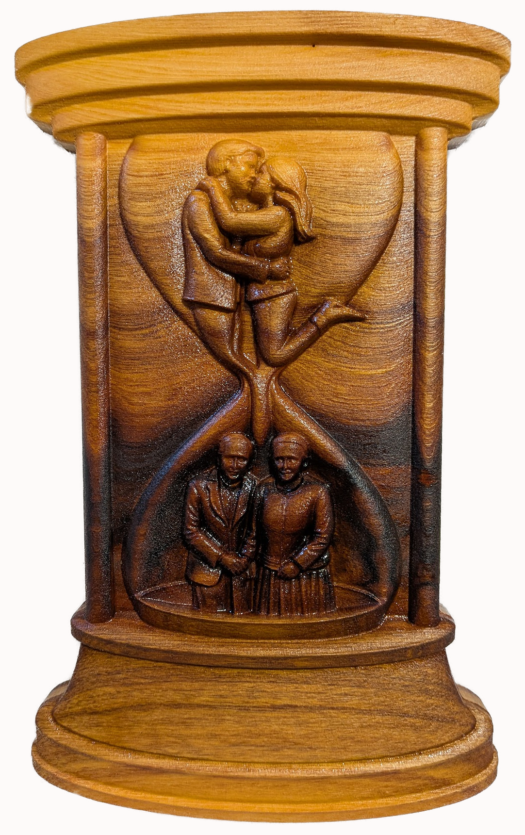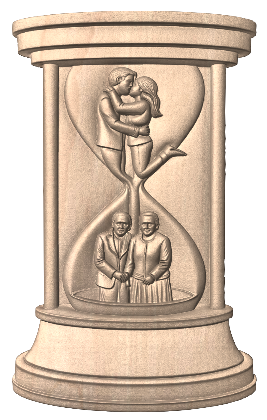 This carved image conveys a deep emotional narrative centered around love, time, and enduring connection.