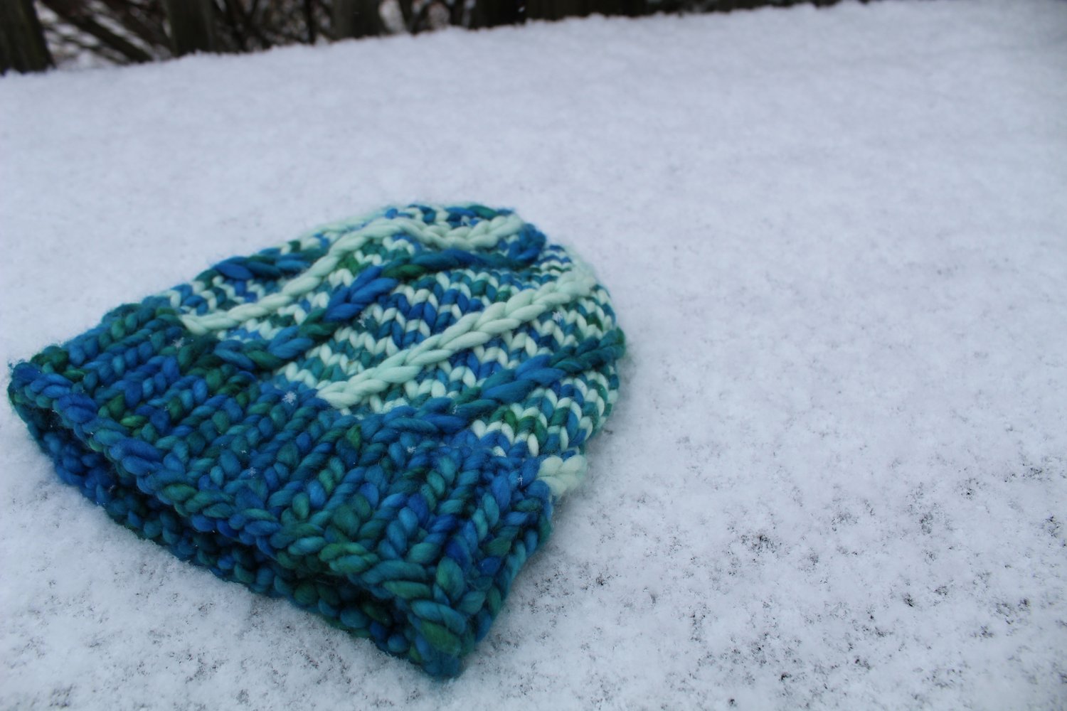 Knit in super bulky Malabrigo Rasta, Frosty Helix is a cozy hat designed to keep you warm in the chilliest weather. It’s knit from the bottom up, utilizing stripes and slipped stitches to create a graceful swirling pattern that continues all the way to the crown.
