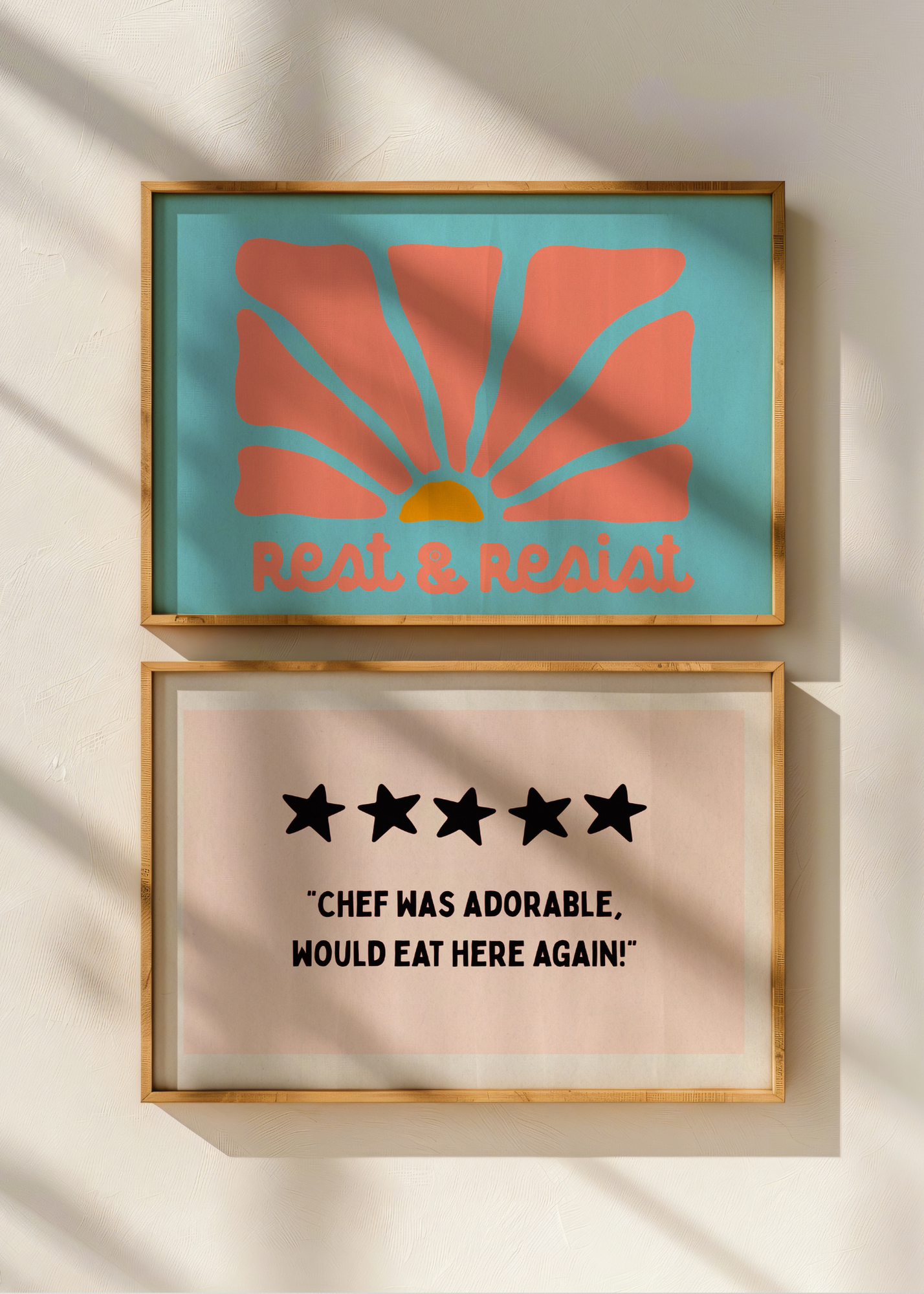 Chef Was Adorable— With its soft blush background and bold five-star review, this cheeky print is both modern and playful. The quote— “Chef was adorable, would eat here again!”—is a wink to charming dinners, comfort food, and the irresistible magic of meals made with love. Perfect for kitchens and dining spaces that value laughter as much as flavor.