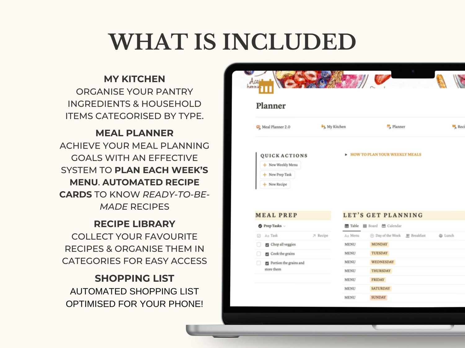• MEAL PLANNER page with Weekly & Monthly planners, easy button automation to create new weekly menus in seconds, and a view of your recipes to draw inspiration from. Includes a handy Meal Prep Task Manager.
