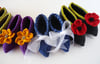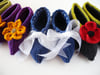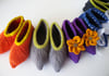 With 4 sizes, 2 edgings, and several different decorations (both knit and crochet) these slippers have an option to make any recipient happy, and will be the only slipper pattern you ever need. Fun to knit and even more fun to wear they are an addictive knit and you may find yourself making pair after pair after pair, trying each variation and mixing and matching colors, edgings, and decorations…