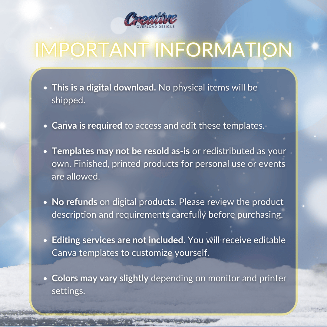 Templates may not be resold as-is or redistributed as your own. Finished, printed products for personal use or events are allowed.