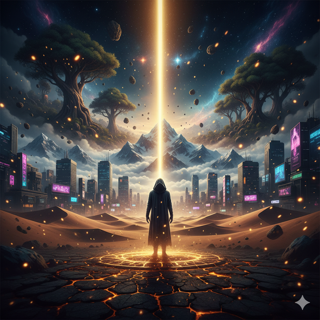 Epic cinematic fantasy cover artwork featuring a lone figure beneath a divine beam of light.