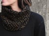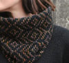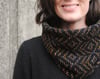The cowl is worked in the round to form a long, straight tube. A provisional cast on is used to start with so that once the cowl is complete, the ends can be grafted together using kitchener stitch for a neat and seamless finish. Stranded colourwork is used on alternate rounds to form a geometric pattern.