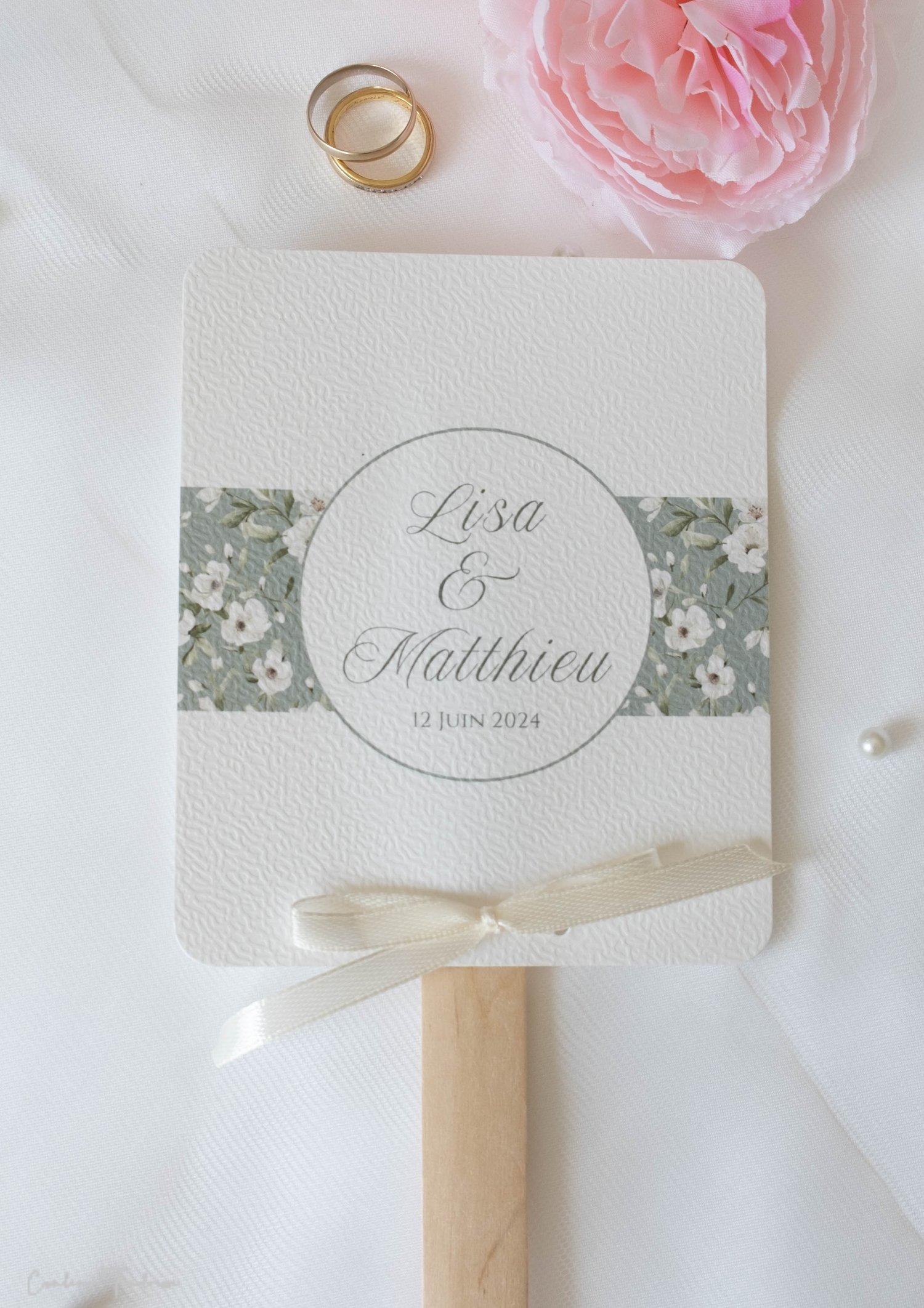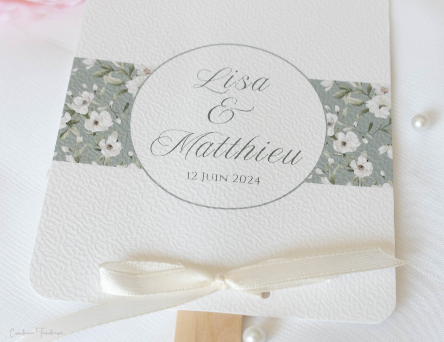 - Design Élégant et Raffiné : Les programmes éventails de mariage de la Collection AIGUES présentent un motif floral blanc crème sur fond vert sauge, créant une atmosphère chic et élégante. Les couleurs choisies évoquent la sérénité et la nature, parfaites pour un mariage printanier ou d'été.