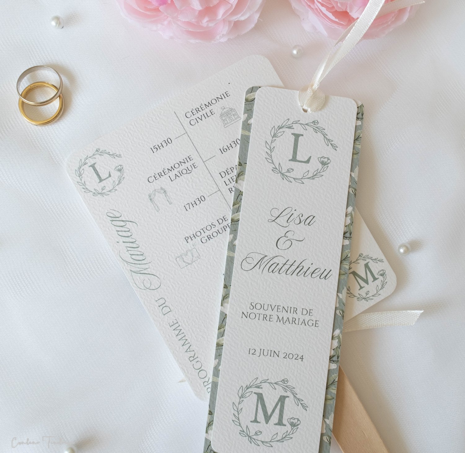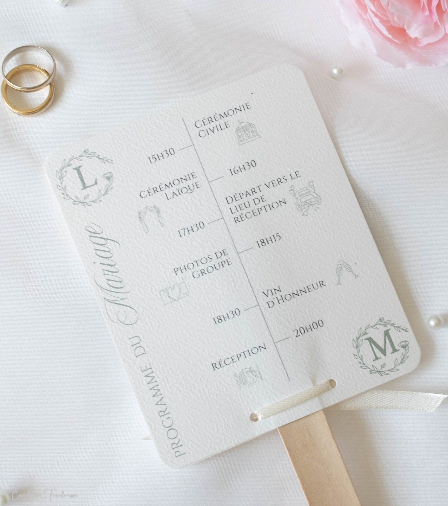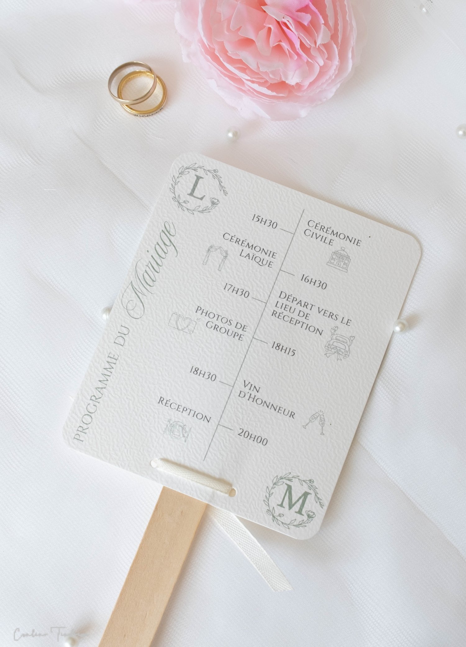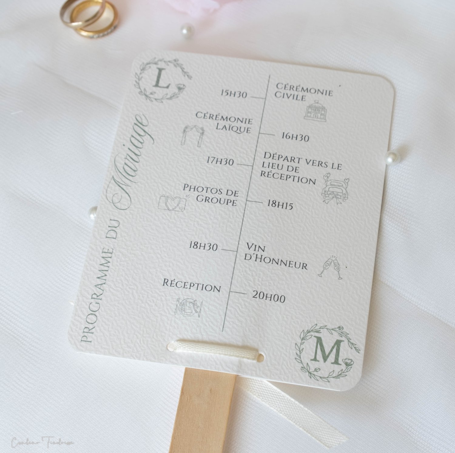 - Personnalisation Sans Limites : Nos créations sont entièrement sur mesure. Chaque programme éventail peut être ajusté selon vos souhaits pour refléter le thème et les couleurs de votre mariage.