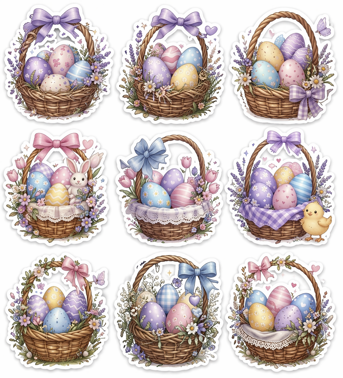 Cute Easter Egg Baskets π£πΈ. - π« What you get: 9 High-quality digital sticker Multiple unique Easter basket designs Soft pastel color palette (pink, blue, yellow, lilac) Cute details: bows, flowers, chicks & bunny elements
