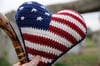 Small crochet boho granny, I Love America flag pillow, made with modern chunky style.