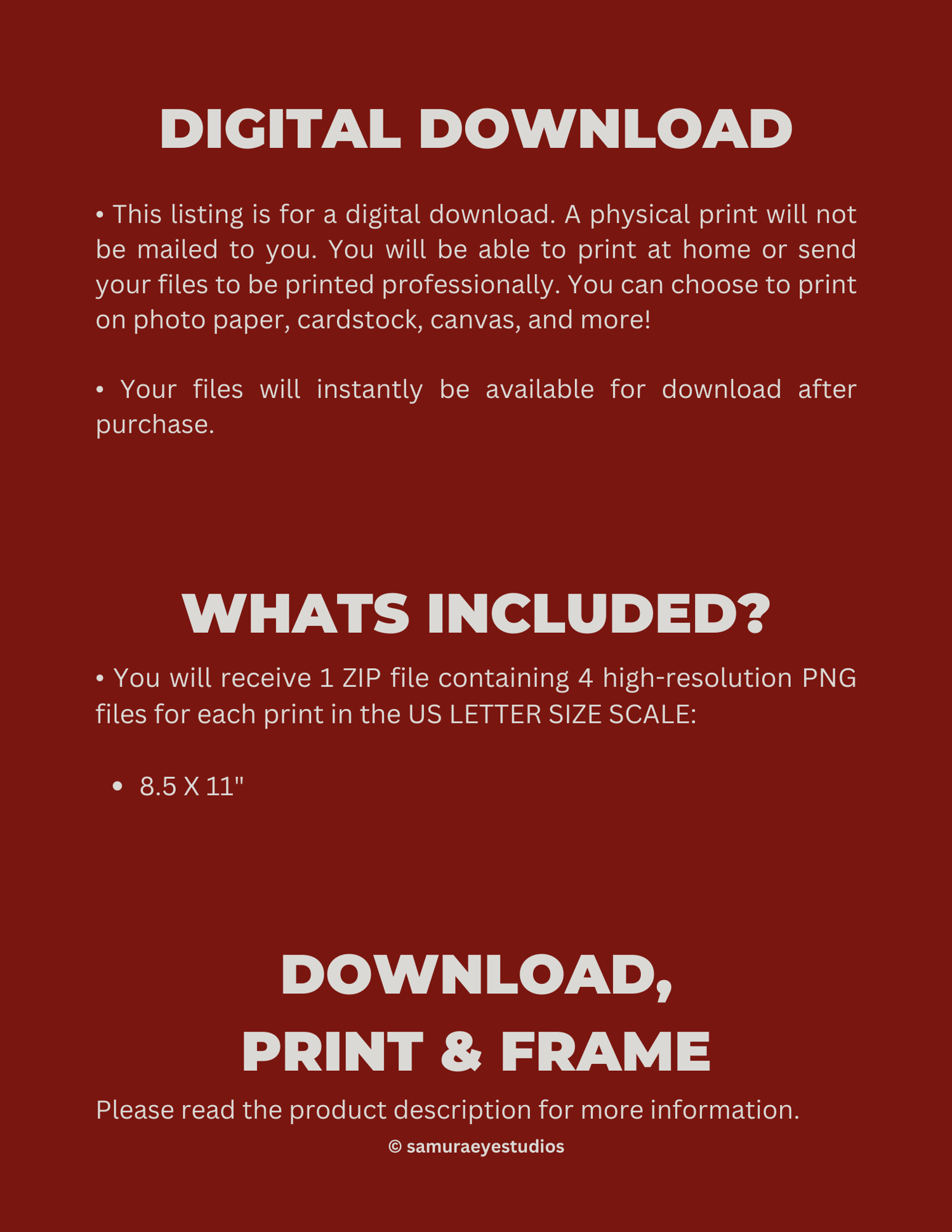 SET OF 4 Maroon Black White Men's Boys Room Decor, Teen Bedroom Prints, Bro Dude Bruh Gift for Gamer Gaming Room Fashion Lover, PNG Closet Decor, Apartment Decor, US LETTER SIZE PORTRAIT ORIENTATION