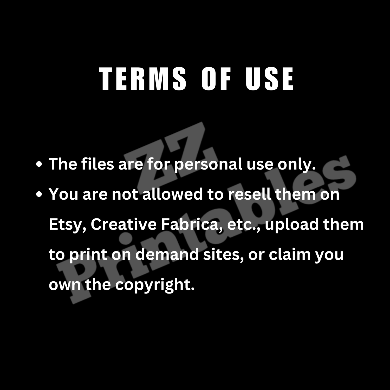 The files are for personal use only. You are not allowed to resell them on Etsy, Creative Fabrica, etc., upload them to print on demand sites, or claim you own the copyright.