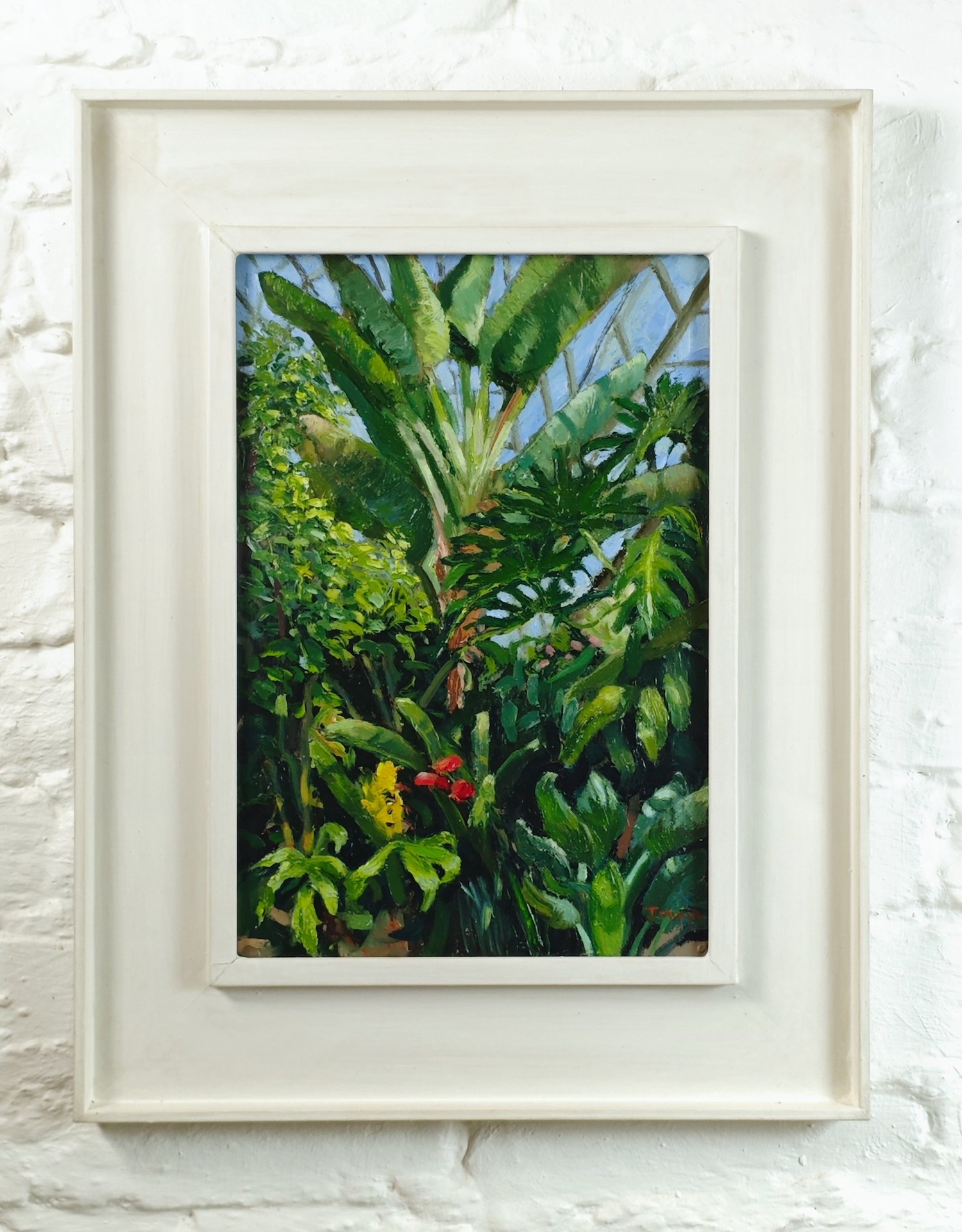 A study of tropical plants within the Abbey’s glasshouse, including banana, monstera, and bird of paradise species. Painted from life, exploring the interplay of filtered light and dense foliage.