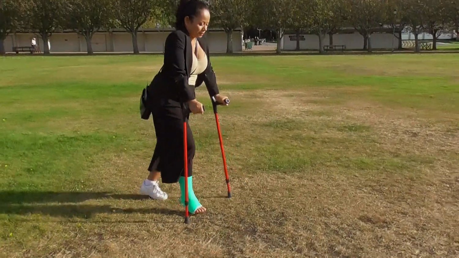 Tila’s right leg is casted in a green SLC. She’s going for a walk in the nice and sunny weather, using two crutchesto get forward. Tila is crutching across the grass on a uneven ground before getting down to the beach. She takes a small paus and we did quick close up of her injured foot. Tila later crutches towards the beach, she sits down on a bench and enjoys the view.