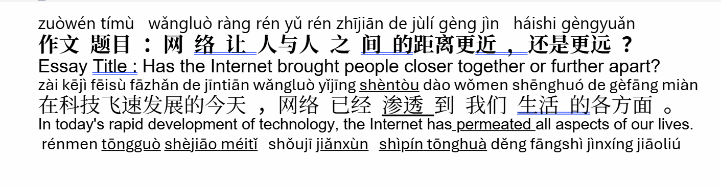 Each essay comes with English, Chinese and pinyin, Glossary, Sample Sentences for the Vocabulary and a quiz. Once being familiarised with the vocabulary students can apply them in related context for their essays.