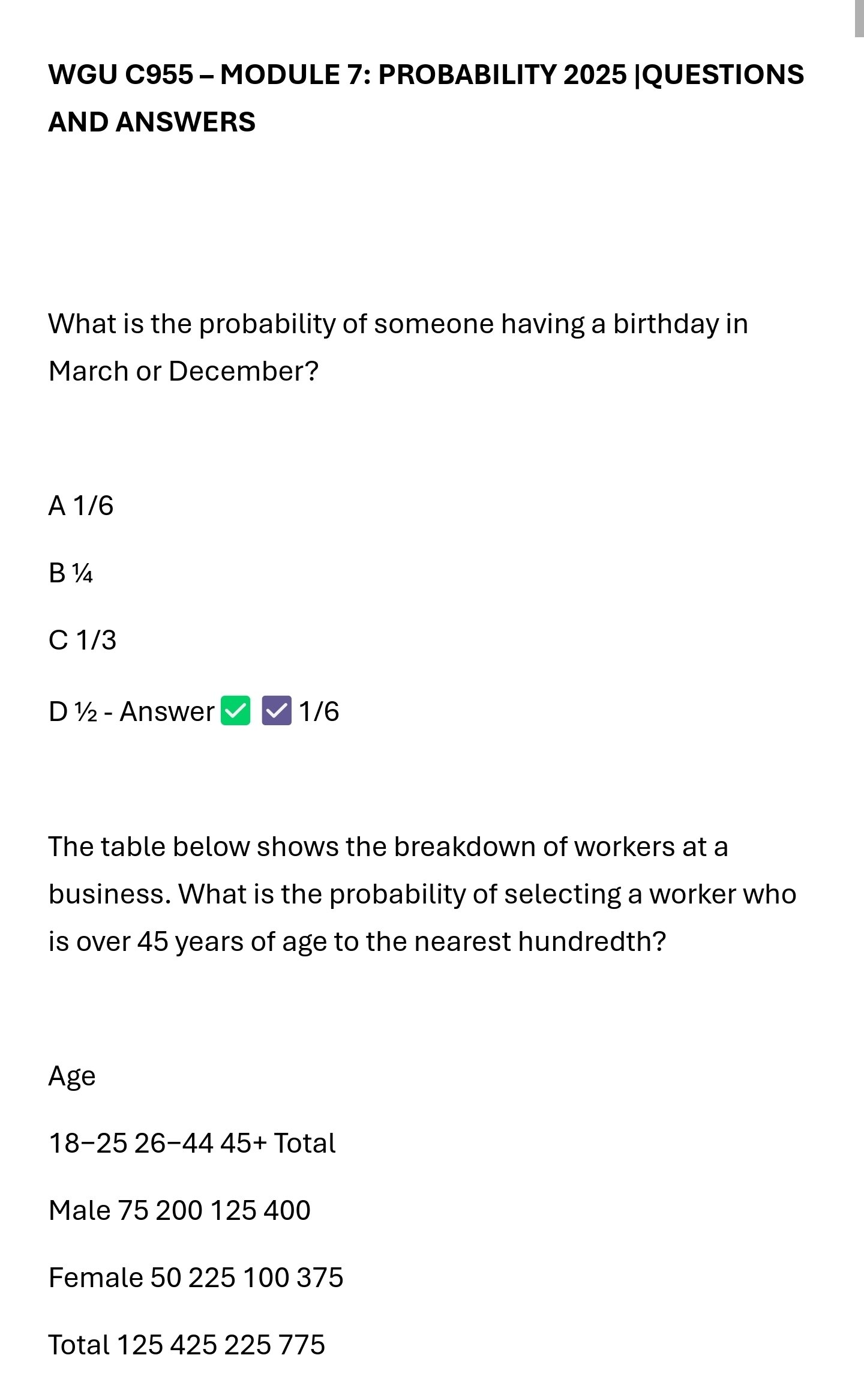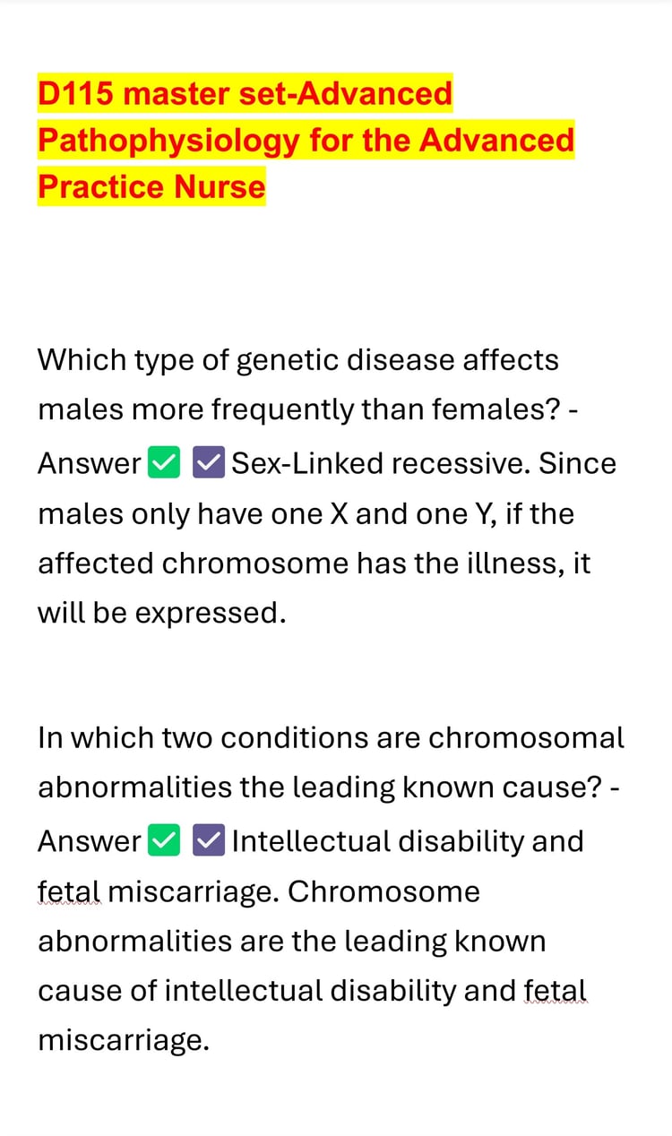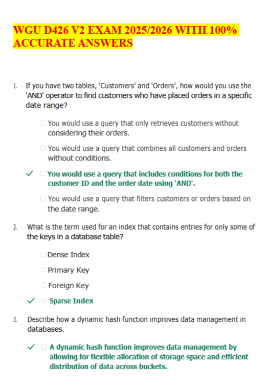 This document contains all questions and verified answers for Module 7: Probability from the WGU C955 course, updated for 2025. It covers essential topics including theoretical and experimental probability, independent and dependent events, conditional probability, and probability distributions. Perfect for mastering statistical reasoning and passing the C955 assessments with confidence.