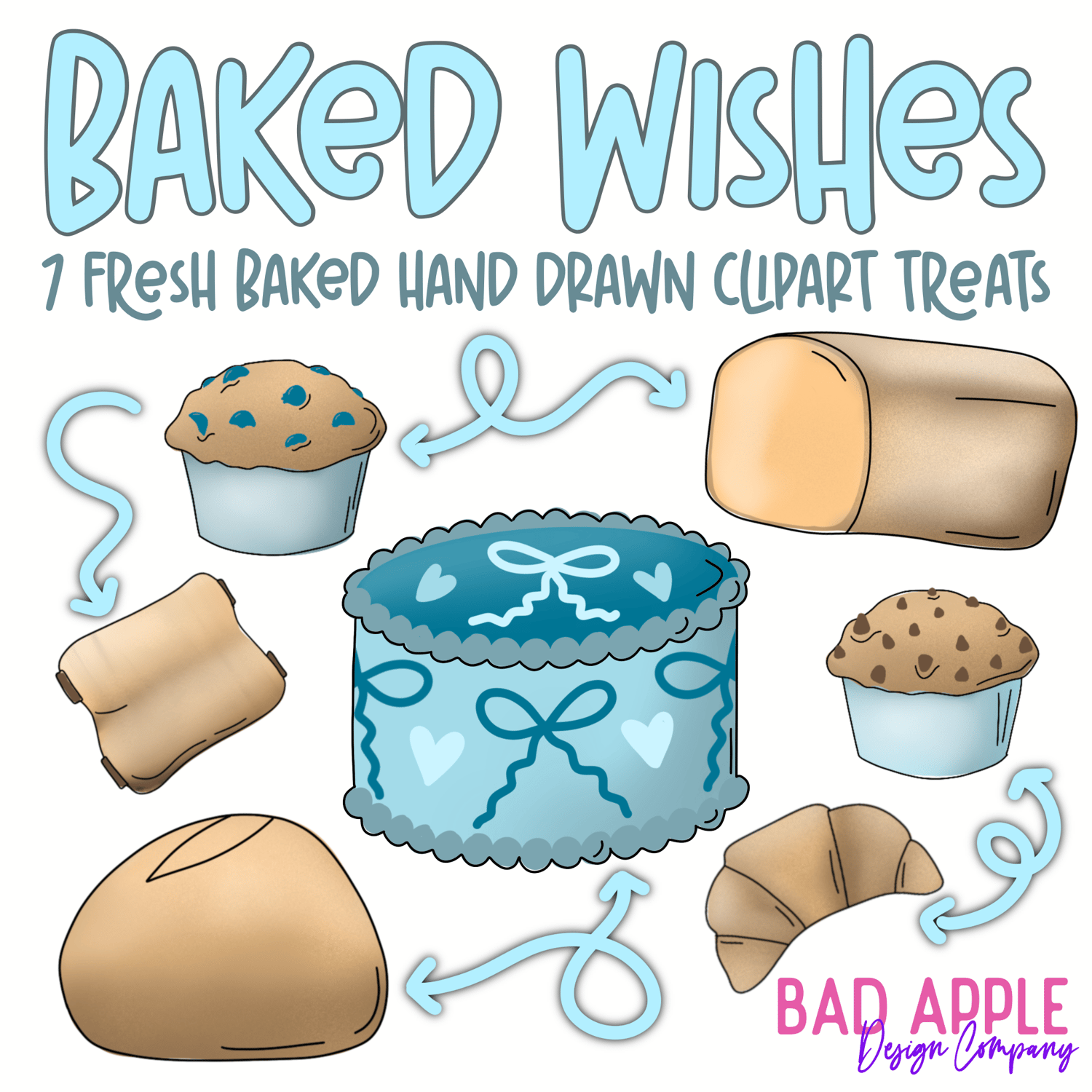 Fresh out of the (digital) oven, Baked Wishes is a cozy collection of hand-drawn baked goods made for feel-good designs. This set includes 7 baking-inspired clipart treats, featuring sweet breads, muffins, croissants, and a charming frosted cake—perfect for adding warmth and whimsy to your projects.