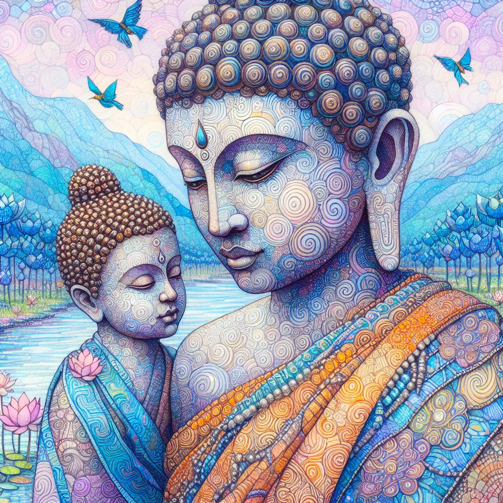 Buddha & child wearing colourful robes beside a beautiful winding river with flowers, trees, mountains & humming birds.