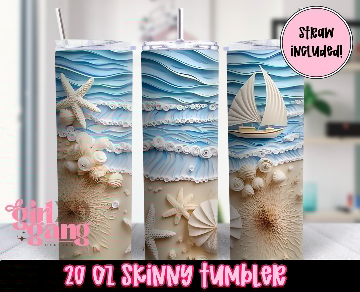 3d Beach theme 20 oz tumbler with plastic straw