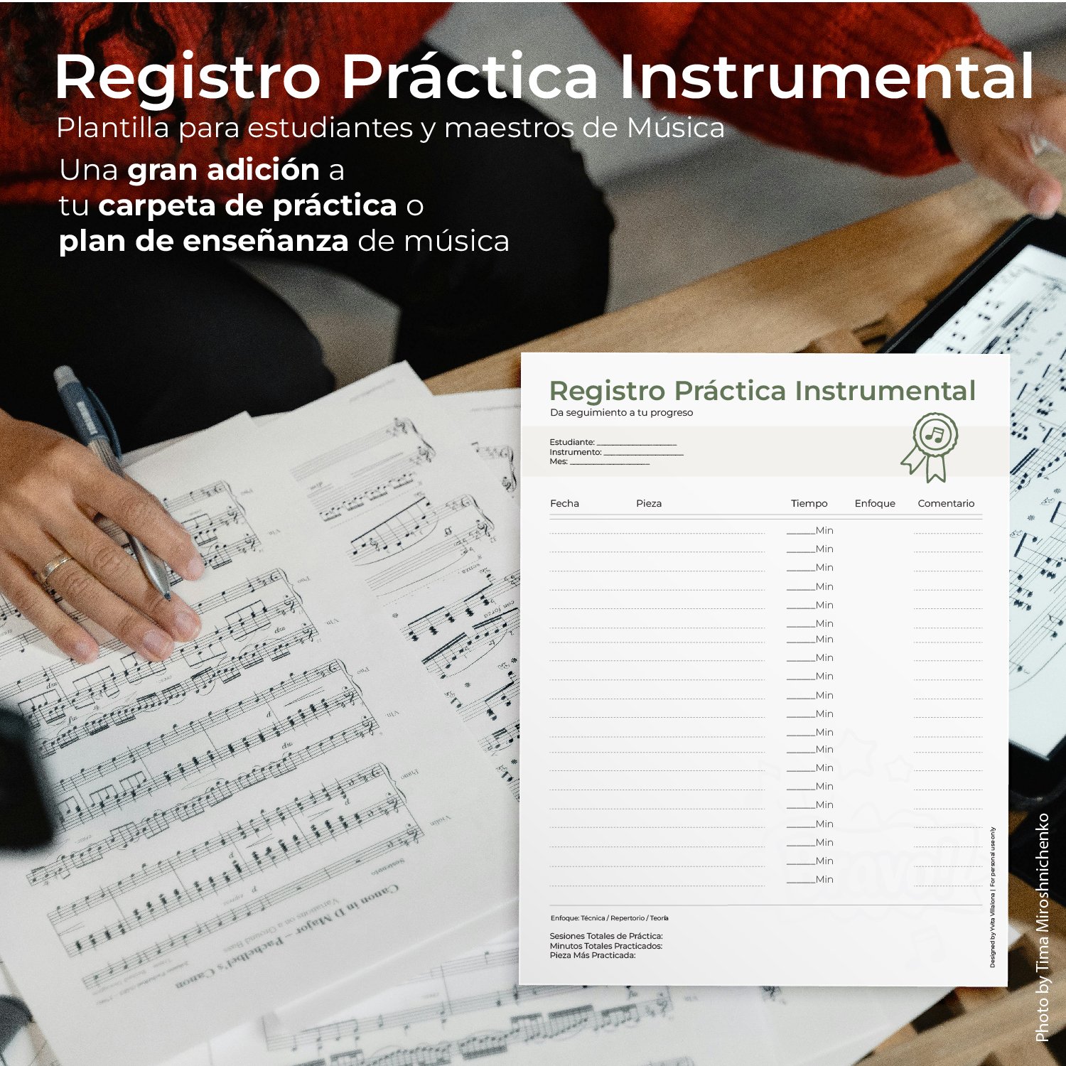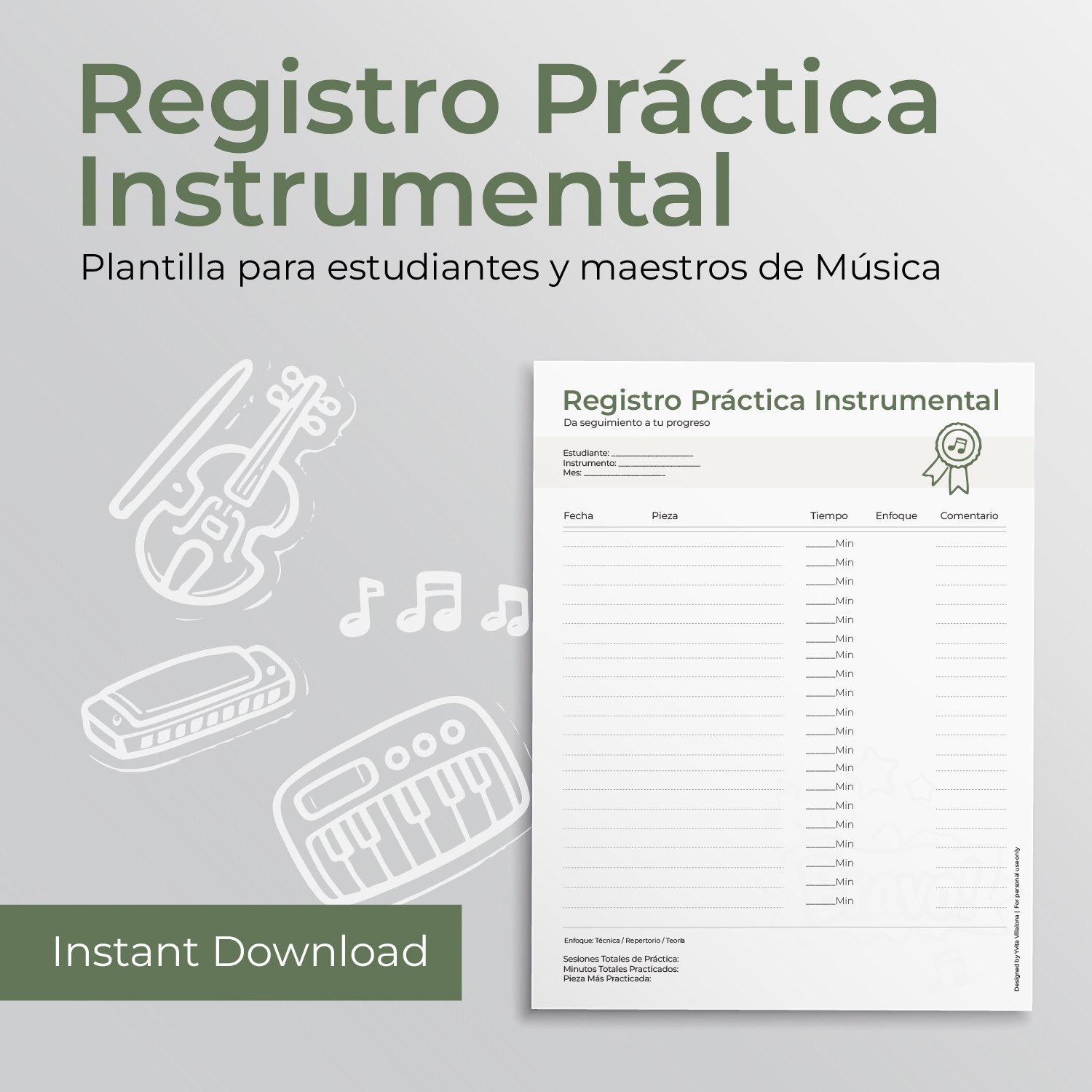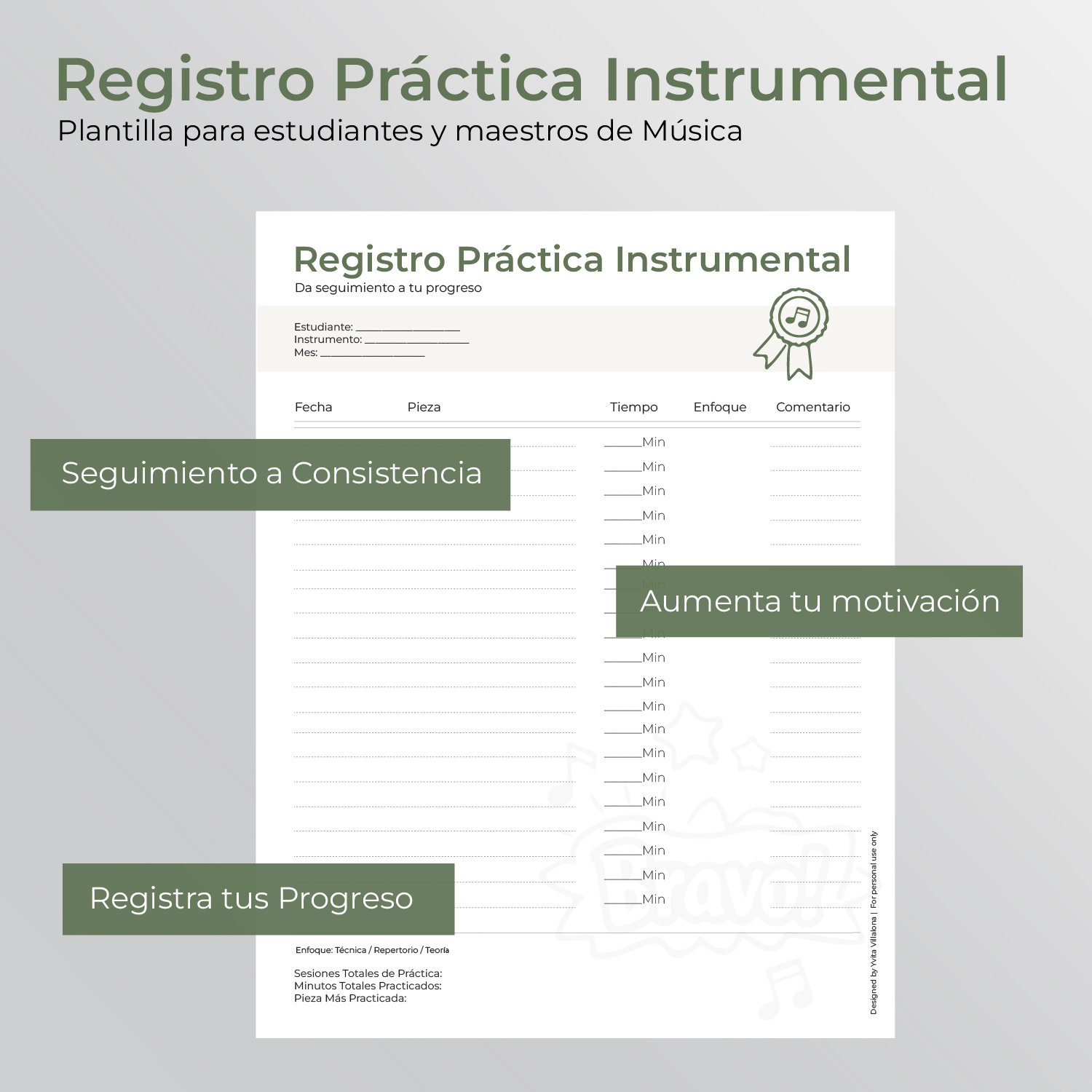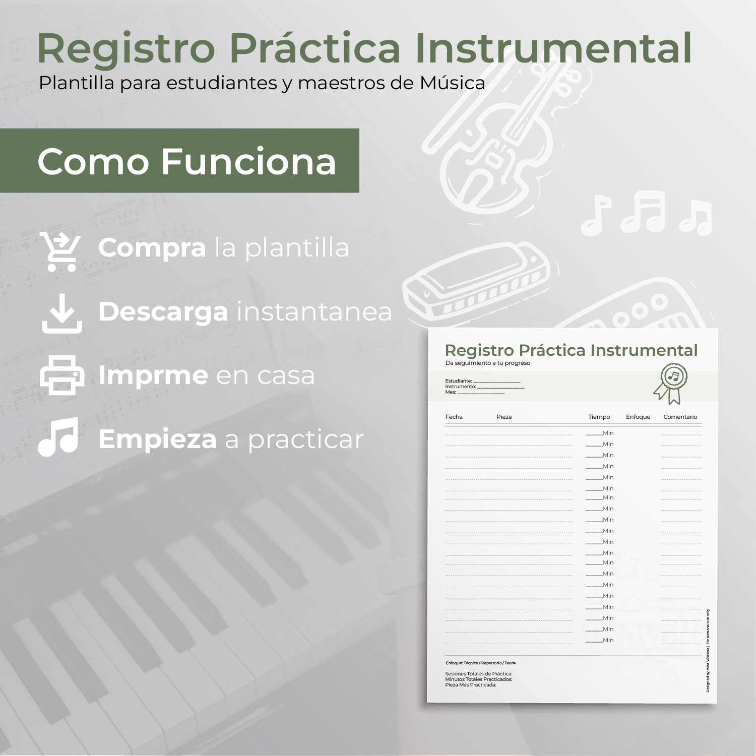 Este registro facilita anotar las piezas practicadas, el tiempo de práctica y las áreas de enfoque, ayudando a los estudiantes a desarrollar rutinas constantes y mantenerse responsables entre clases. También es una herramienta útil para que estudiantes y profesores revisen hábitos de práctica y observen el progreso a lo largo del tiempo.